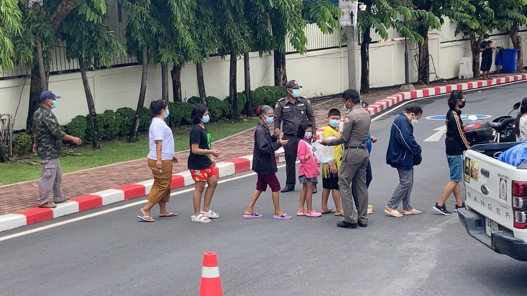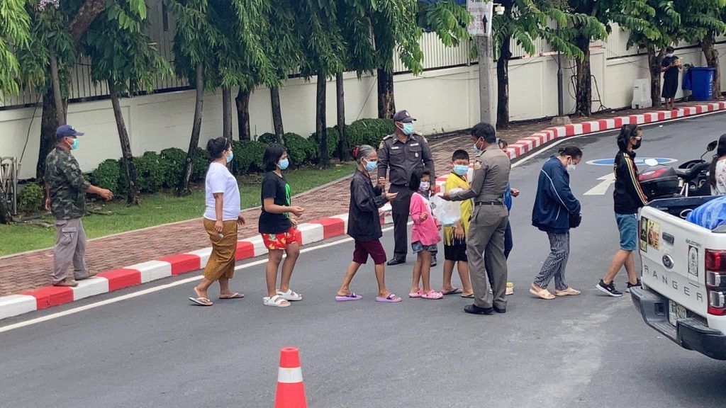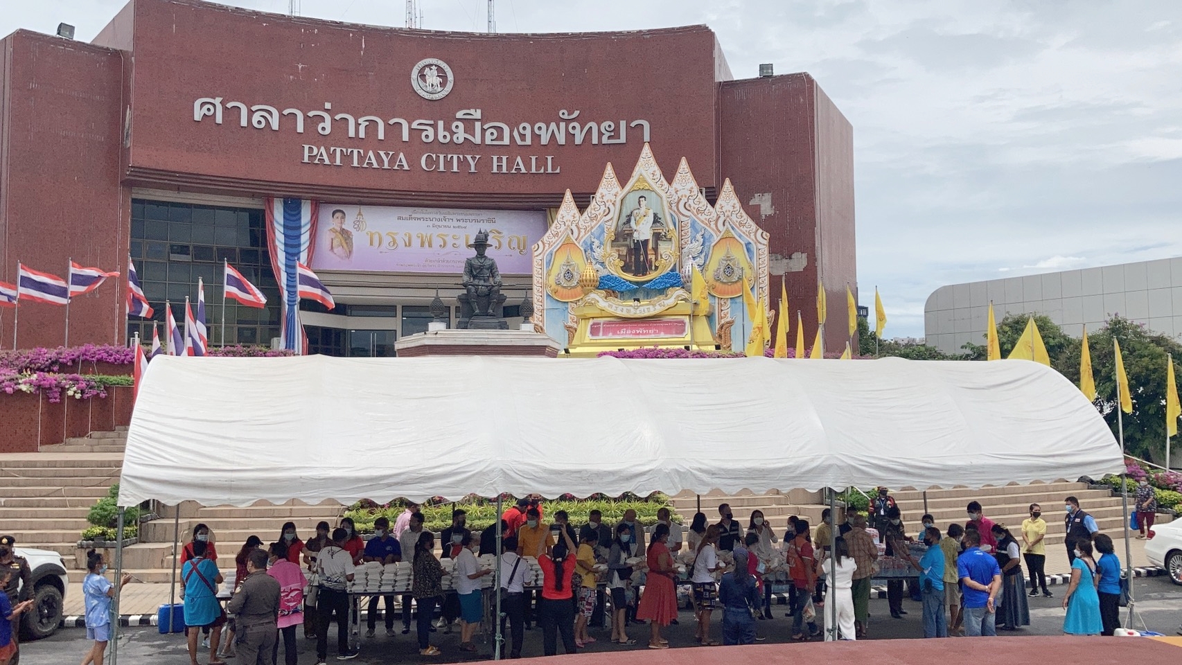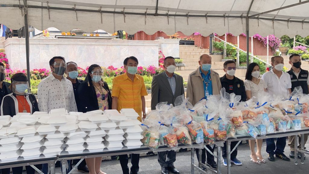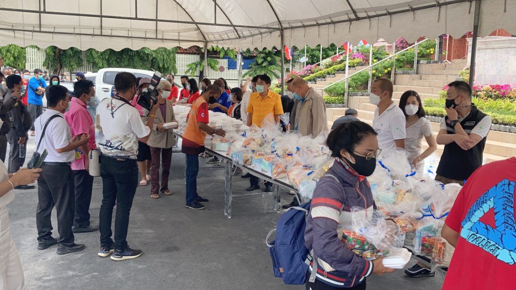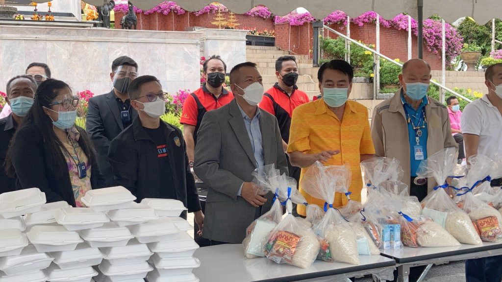 ต่อมาได้เดินทางไปมอบถุงยังชีพบรรจุข้าวสารอาหารแห้งและสิ่งจำเป็นในการดูแลตัวเองเพื่อป้องกันโรคติดต่อ อาทิ แอลกอฮอล์เจล และหน้ากากอนามัย รวมจำนวน 300 ถุง ข้าวกล่องปรุงสำเร็จจำนวน 400 กล่อง และน้ำดื่มจำนวน 1,200 ขวด ส่งมอบให้กับเมืองพัทยาเพื่อแจกจ่ายให้กับประชาชน โดยมี นายรณกิจ เอกะสิงห์ นายบรรลือ กุลละวณิชย์ รองนายกเมืองพัทยา ร่วมรับมอบก่อนแจกจ่ายสิ่งของให้กับประชาชนที่เดินทางมารอรับแจกตั้งแต่ช่วงสายของวัน