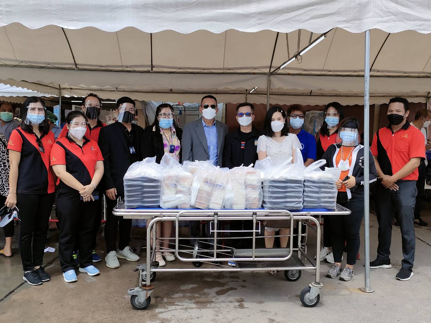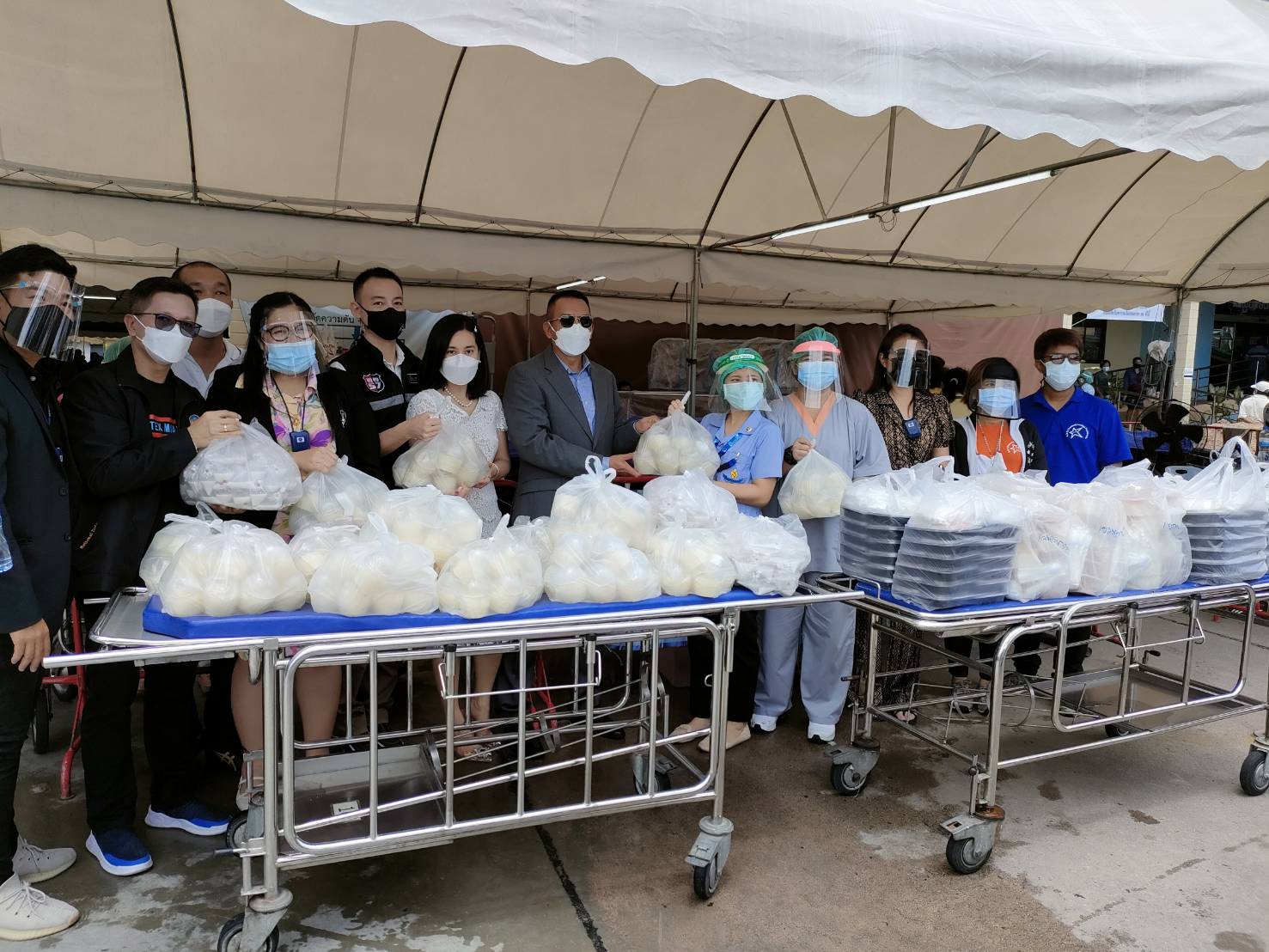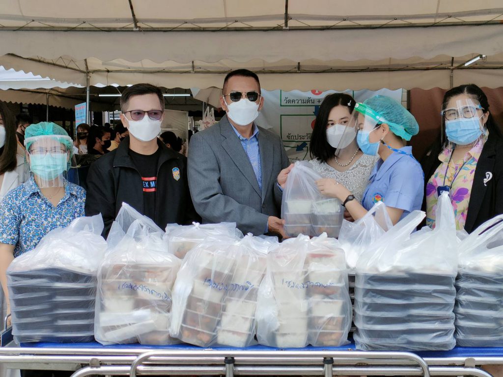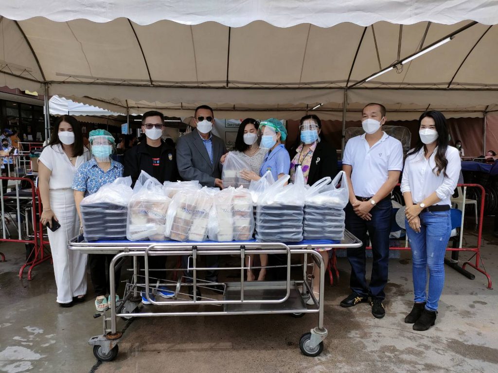 ทั้งนี้ ในช่วงเช้าทางคณะผู้ใจบุญได้เดินทางไปยังโรงพยาบาลบางละมุง ซึ่งเป็นนำข้าวกล่องปรุงสำเร็จ ขนมหวานและน้ำดื่ม รวมจำนวน 200 ชุด ส่งมอบให้กับตัวแทนของโรงพยาบาลบางละมุง โดย นพ.ชาญชัย ลิ้มธงเจริญ รองผู้อำนวยการโรงพยาบาล และคณะเจ้าหน้าที่บุคลากรทางการแพทย์ร่วมรับมอบสิ่งของ เพื่อนำไปแจกจ่ายให้กับเจ้าหน้าที่ที่ปฏิบัติงานในการให้บริการวัคซีนป้องกันโรคโควิด-19 ในระบบหมอพร้อมตามการจัดสรรของสำนักงานสาธารณสุขจังหวัดชลบุรี และคณะกรรมการควบคุมโรคติดต่อจังหวัดชลบุรี