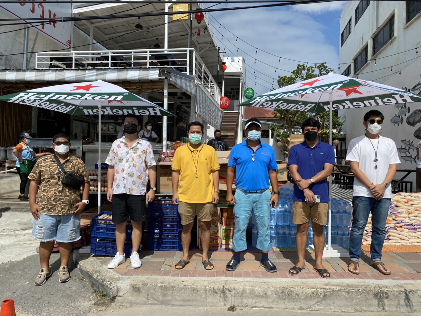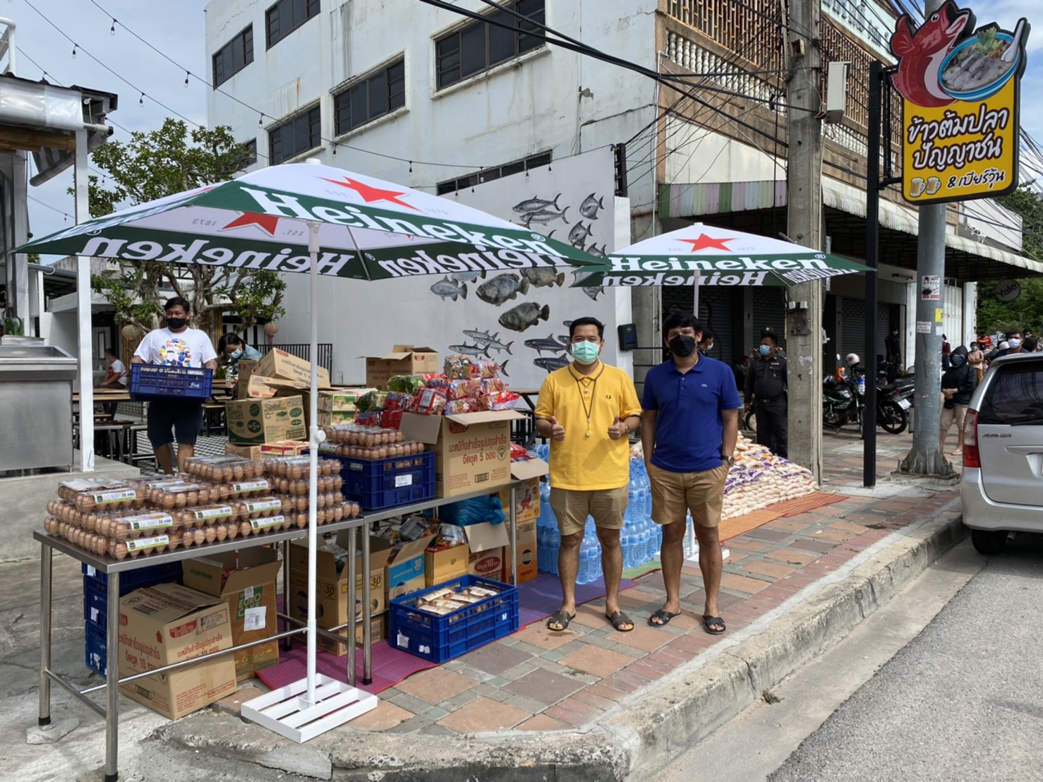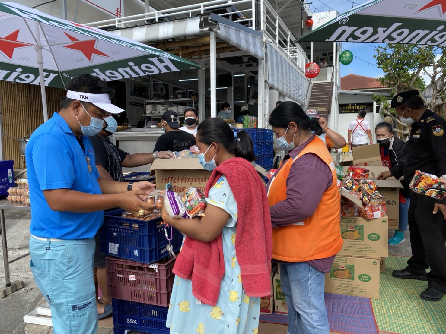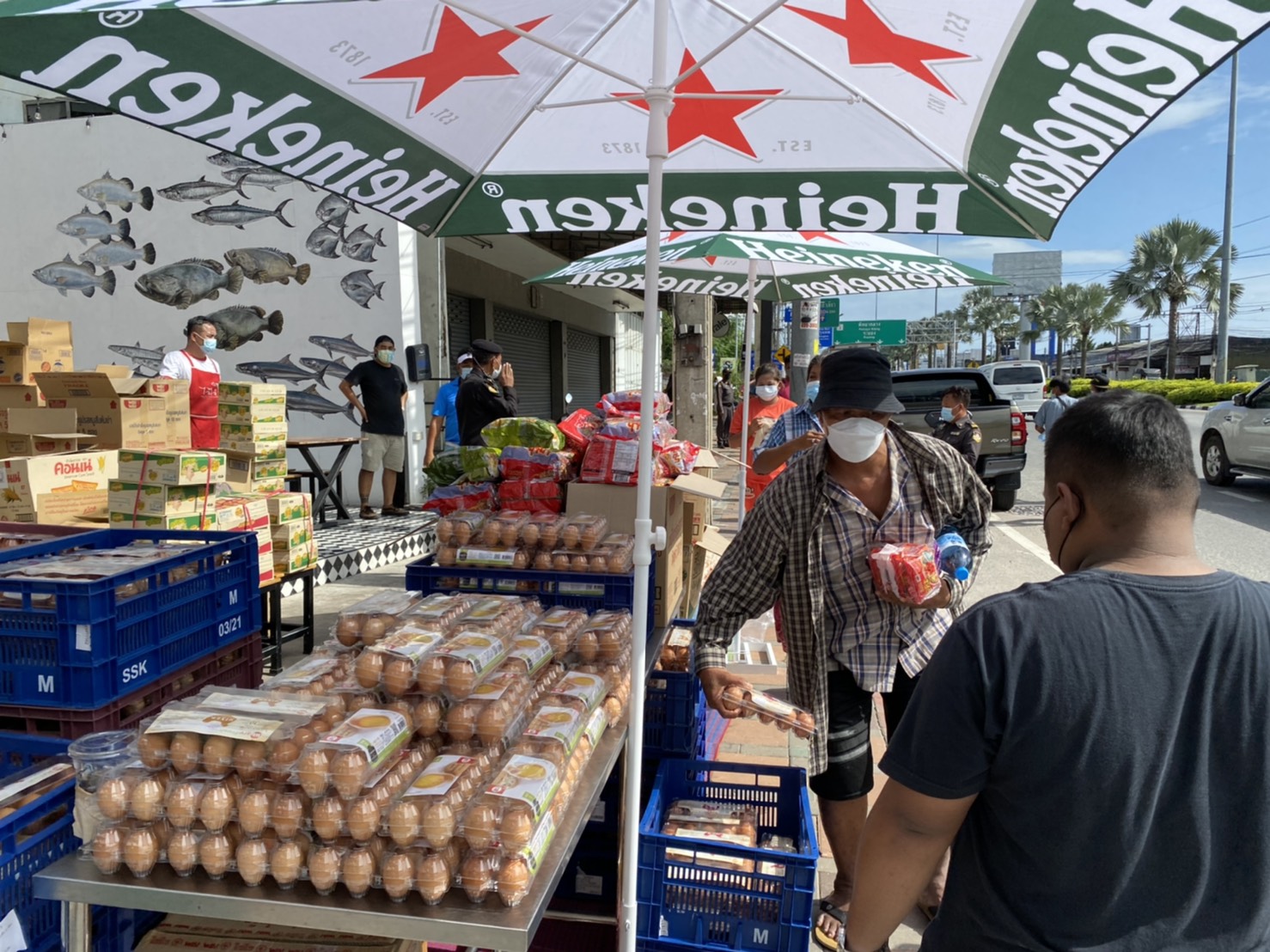 ซึ่งบรรยากาศร้านข้าวต้มเฮียเหลา พัทยา มีประชาชนทั้งเด็กและผู้ใหญ่ต่างมายืนต่อคิวเพื่อรอรับสิ่งของแจกเป็นจำนวนมาก โดยสิ่งของที่แจกให้กับประชาชนที่ได้รับผลกระทบจากพิษโควิค19 อาทิเช่น ข้าวสาร ไข่ไก่ บะหมี่กึ่งสําเร็จรูป น้ำเปล่า ซึ่งประชาชนที่มายืนเข้าคิวจะได้รับ ข้าวสาร 1 กิโลกรัม ไข่ไก่ 1 แพ็ค มี 10 ฟอง บะหมี่กึ่งสําเร็จรูป 1 แพ็ค มี 6 ซอง น้ำดื่ม 1 ขวดต่อ 1 คน โดยสิ่งของที่นำมาแจกนั้นมีจำนวนกว่า 1,500 ชุด โดยมีเจ้าหน้าที่เทศกิจเมืองพัทยาคอยดูแลอำนวยความสะดวกให้กับประชาชน โดยมีการตรวจวัดอุณหภูมิ และล้างมือด้วยเจลแอลกอฮอล์ก่อนเข้ามารับสิ่งของแจก