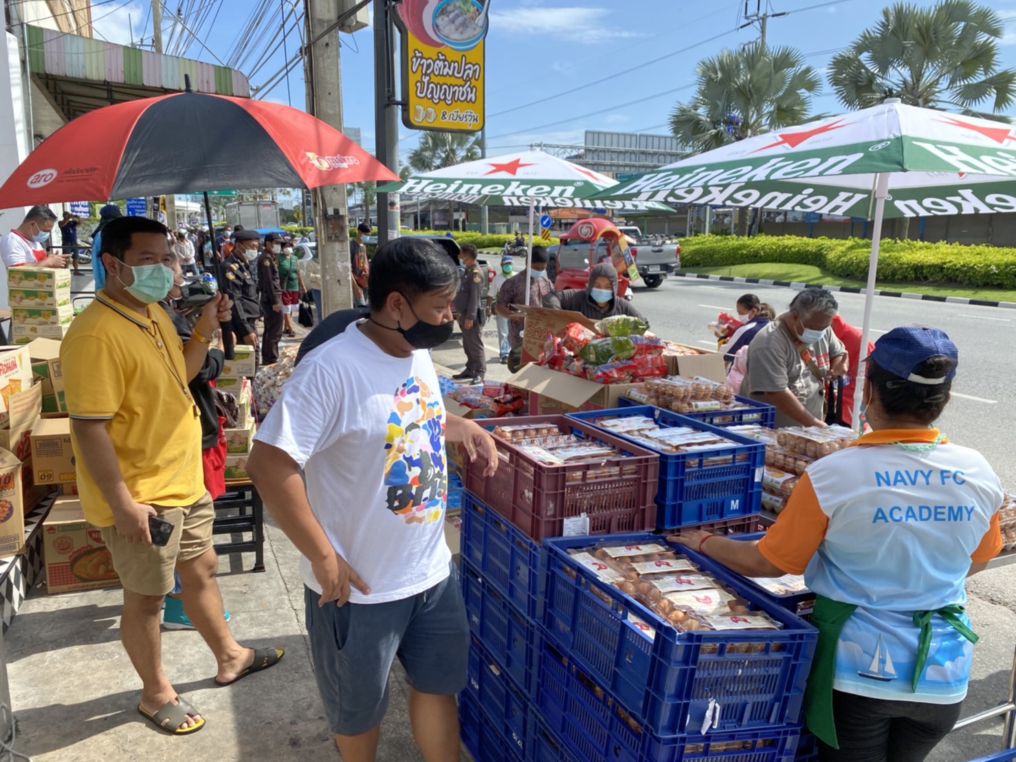 วันนี้ 18 ก.ค. 2564 ที่ร้านข้าวต้มเฮียเหลา พัทยา อ.บางละมุง จ.ชลบุรี มีประชาชนที่ได้รับผลกระทบจากพิษโควิค19 มายืนต่อคิวยาวกว่า 100 เมตร เพื่อมาเข้าคิวรอรับข้าวสาร ไข่ไก่ บะหมี่กึ่งสําเร็จรูป น้ำดื่ม โดยมีเจ้าหน้าที่เทศกิจจากเมืองพัทยาคอยดูแลอำนวยความสะดวก