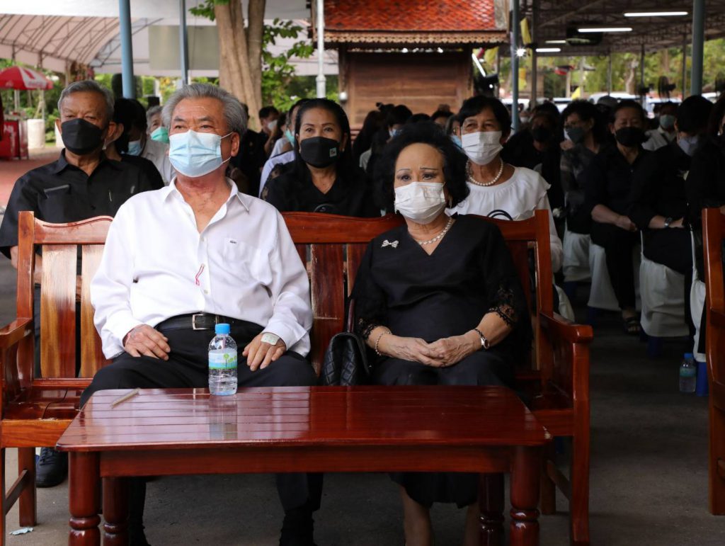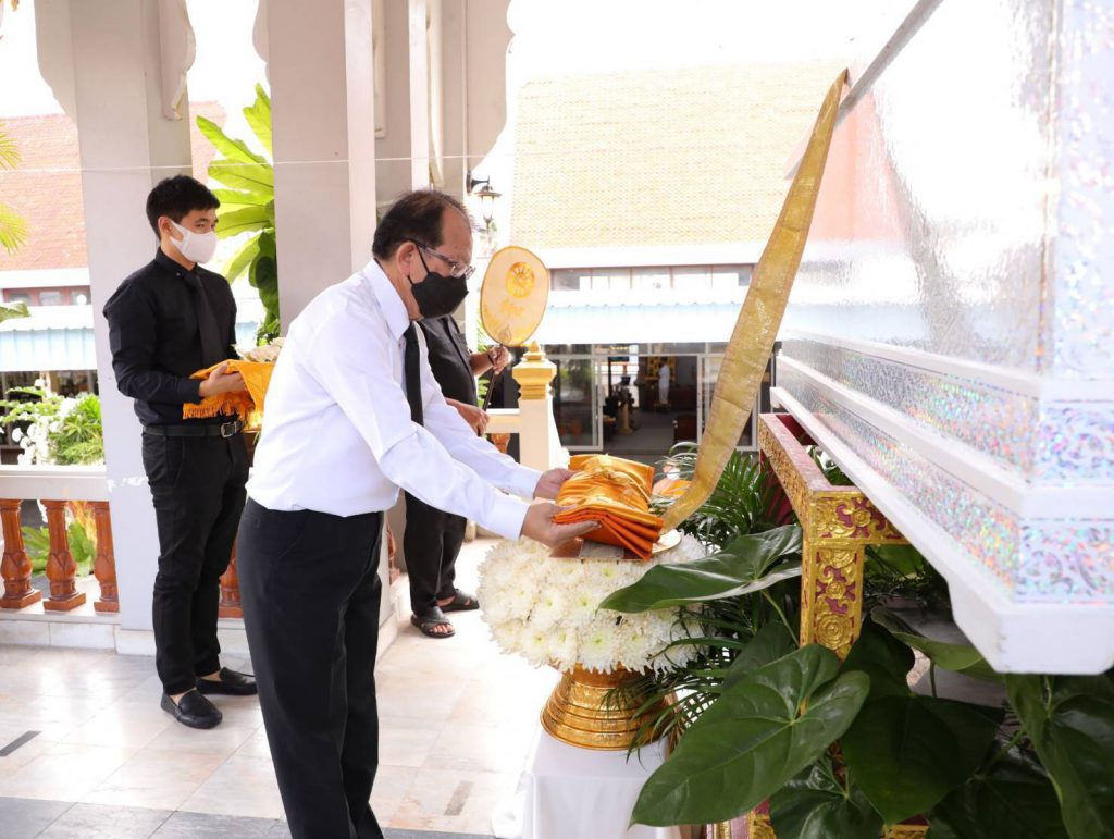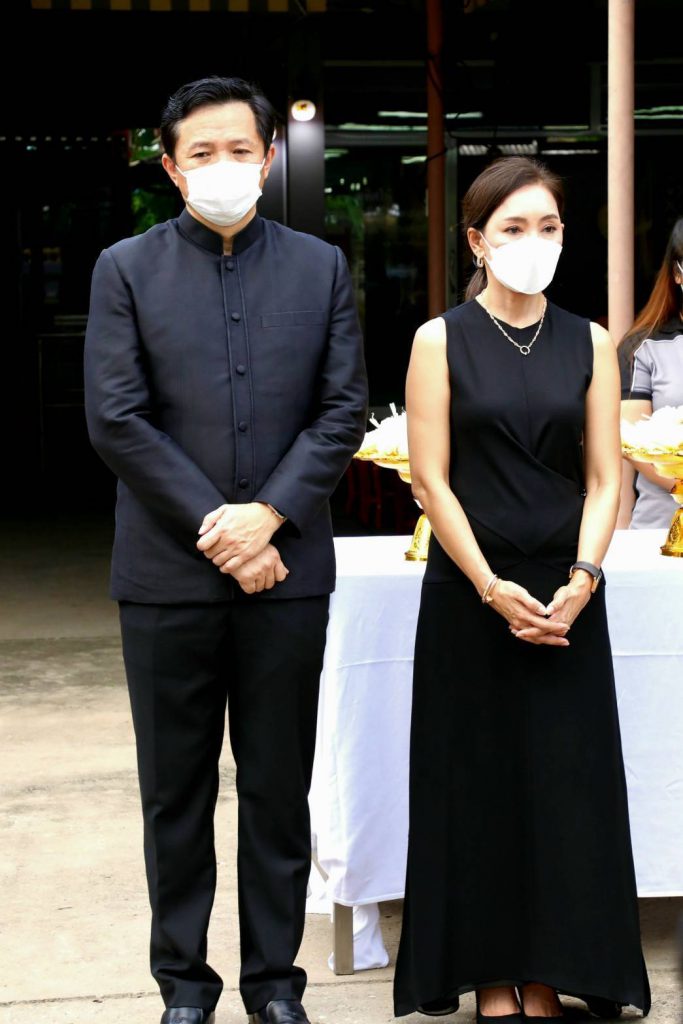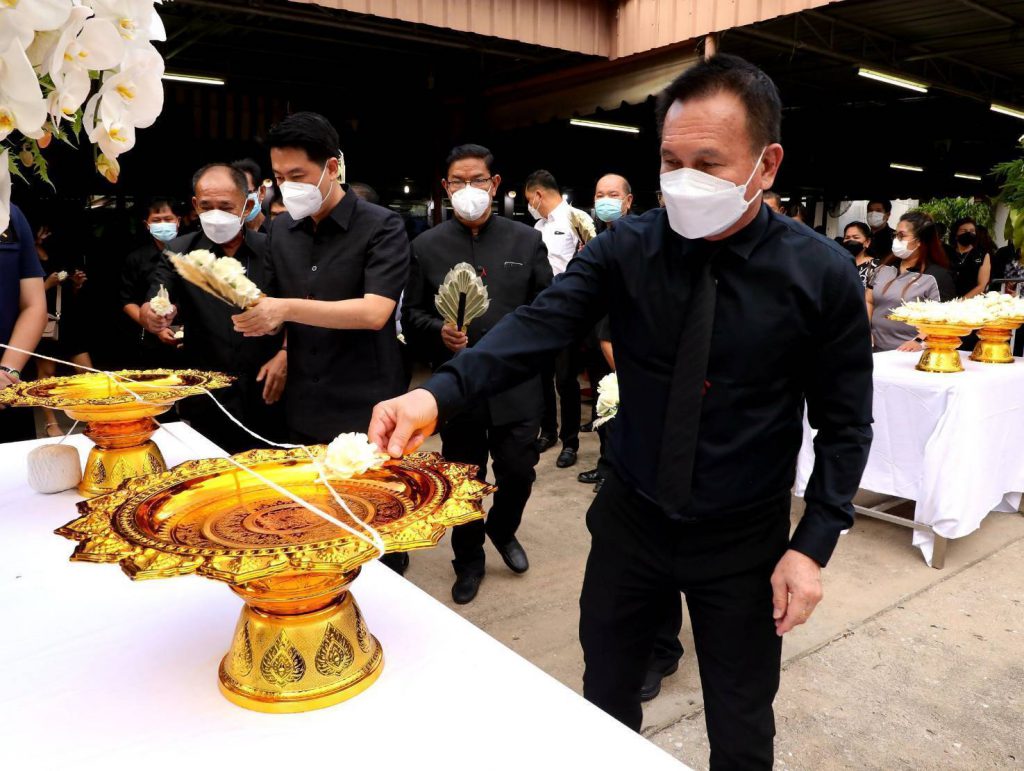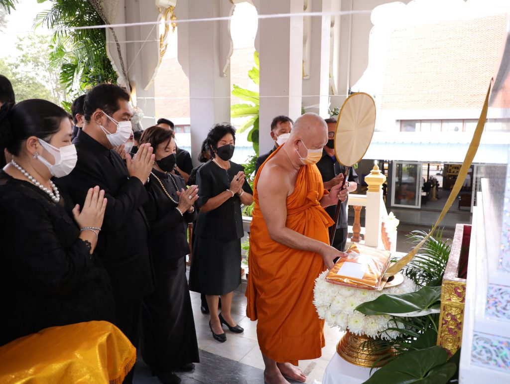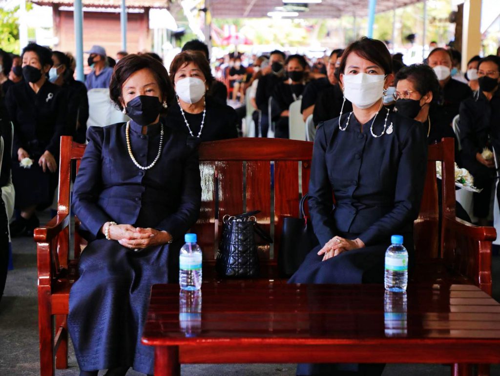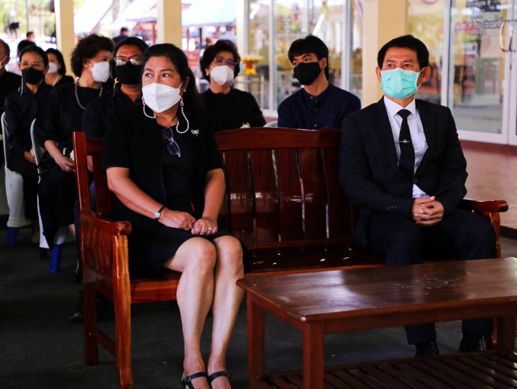 โดยมี นางสุภาพร เทียนไชย นายกเหล่ากาชาด จังหวัดชลบุรี เป็นประธานฝ่ายฆราวาสทอดผ้ามหาบังสุกุลและเป็นประธานในพิธี พร้อม แขกผู้มีเกียรติร่วมแสดงความไว้อาลัยหลายท่าน อาทิ นายปรเมศวร์ งามพิเชษฐ์ ผู้ช่วยรัฐมนตรีกระทรวงวัฒนธรรม, นายสุรสิทธิ์ นิธิวุฒิวรรักษ์ ส.ส.ระบบบัญขีรายชื่อ พรรคพลังประชารัฐ, นายวิวัฒน์ มหาผลศิริกุล รองผู้ว่าราชการจังหวัดชลบุรี, นายเรวัต ผลลูกอินทร์ รองนายก อบจ.ชลบุรีพร้อมคณะสมาชิก อบจ.ชลบุรี, นายพันธุ์ศักดิ์ เกตุวัตถา อดีต ส.ส.ชลบุรี, นักการเมืองท้องถิ่น ผู้นำท้องถิ่น ข้าราชการตำรวจ ญาติพี่น้อง ร่วมงานพิธีอย่างพร้อมเพรียง……..
