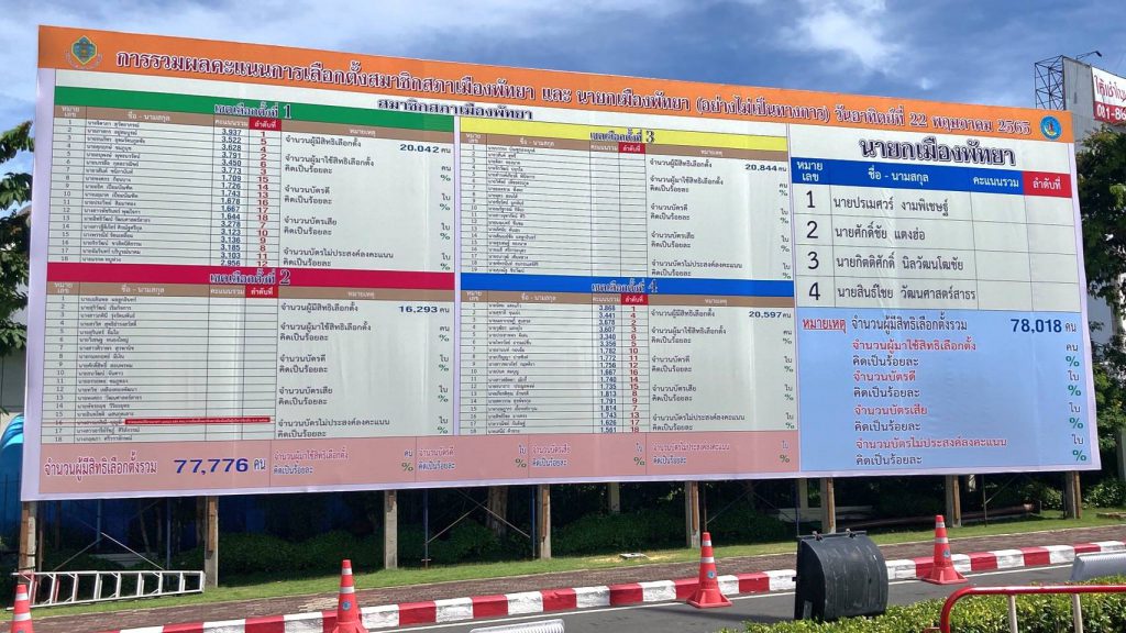 ทั้งนี้ผลการนับคะแนนในการเลือกตั้งนายกเมืองพัทยา ก่อน กกต.จะมีคำสั่งให้เลือกตั้งใหม่ใน 2 เขตดังกล่าวนั้น ปรากฏว่า นายปรเมศวร์ งามพิเชษฐ์ ตัวแทนบ้านใหญ่แสนสุข มีคะแนนนำ ดังนี้