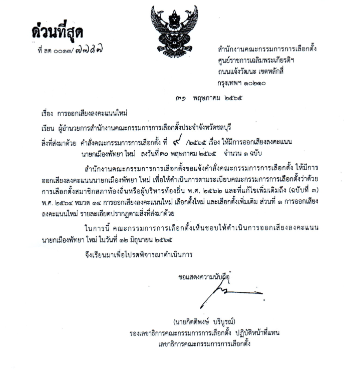 ล่าสุดวันนี้ (31 พ.ค. 2565 ) สำนักงานคณะกรรมการการเลือกตั้งประจำจังหวัดชลบุรี ออกหนังสือด่วนที่สุดที่ ลต(ชบ) 0002/556 เรื่องการออกเสียงลงคะแนนนายกเมืองพัทยาใหม่ มายังเมืองพัทยาพร้อมเอกสารแนบ 2 รายการ