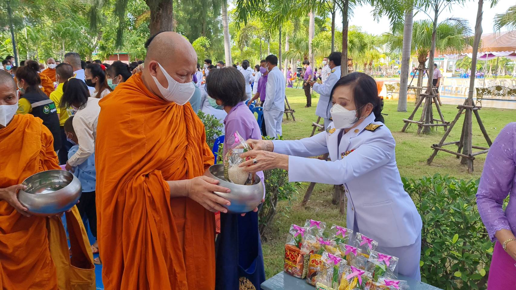 จากนั้น ประธานในพิธี และ นายประภัส เจริญสันติสุข รองนายกเทศมนตรีเมืองศรีราชา พร้อมคณะผู้บริหาร ภาครัฐ เอกชนและชาวชุมชน ร่วมตักบาตรข้าวสารอาหารแห้งแด่พระภิกษุสงฆ์ จำนวน 45 รูป เพื่อถวายเป็นพระราชกุศลแด่สมเด็จพระนางเจ้าสุทิดา พัชรสุธาพิมลลักษณ พระบรมราชินี