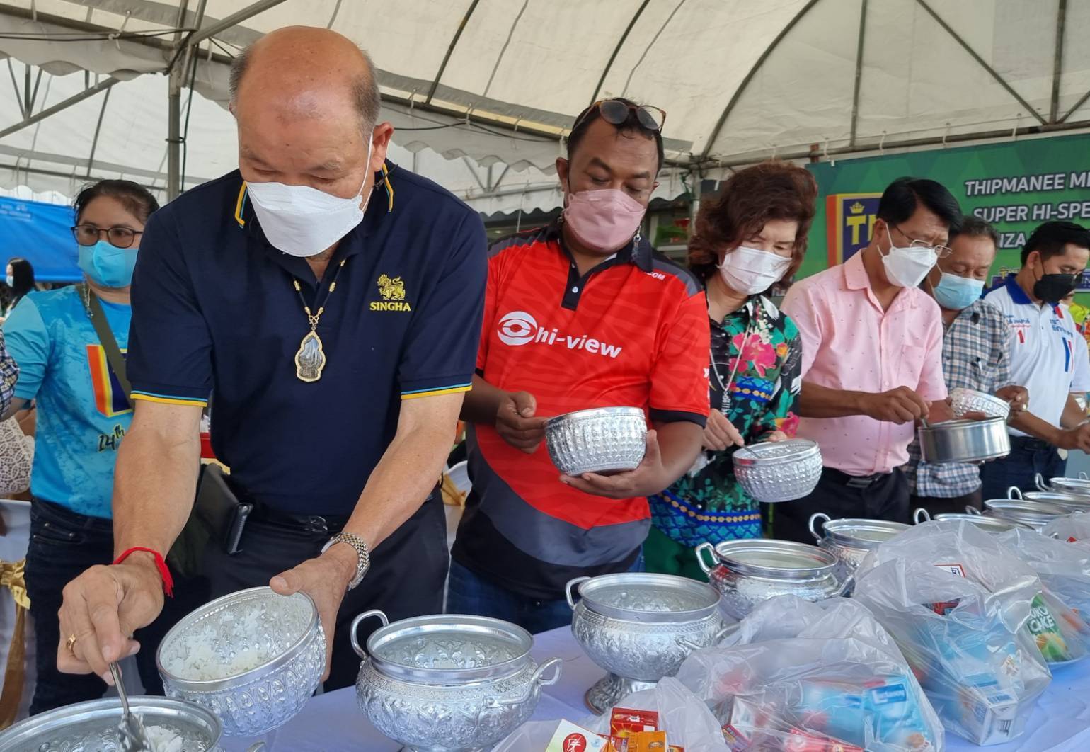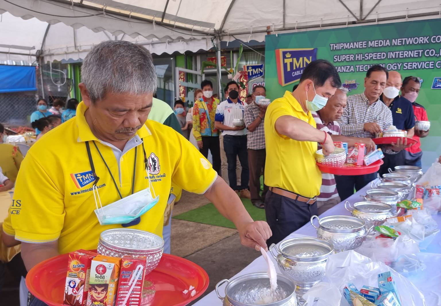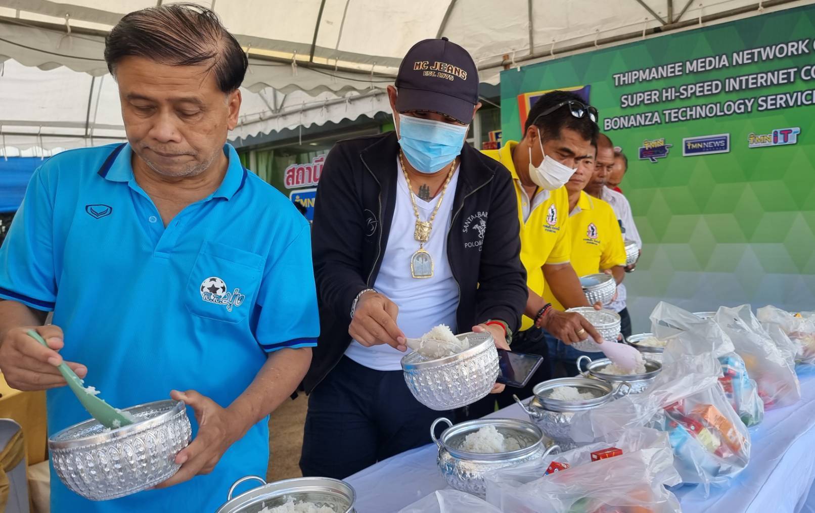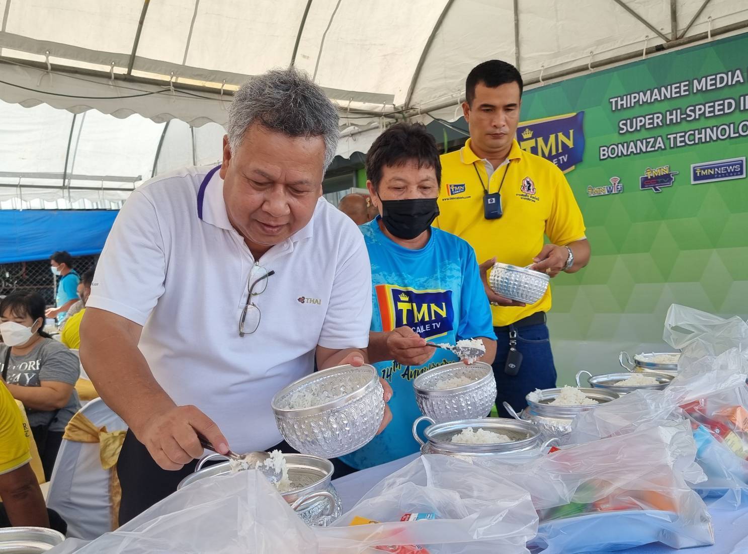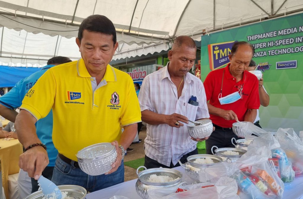 โดยเริ่มพิธีในช่วงเช้าด้วยการใหว้เจ้าที่เจ้าทาง เทวดาฟ้าดิน และพิธิทำบุญตักบาตรเริ่มขึ้นเวลา 10:30 น. นำโดย นายสมสิน ทิพย์มณี ประธานกรรมการบริหารบริษัททิพย์มณี มีเดียเน็ตเวิร์ค จำกัด นายสยามรัช ทิพย์มณี ผู้จัดการทั่วไปบริษัททิพย์มณี มีเดียเน็ตเวิร์ค จำกัด พร้อมผู้บริหารและพนักงาน ได้นิมนต์พระสงฆ์สวดเจริญพระพุทธมนต์เพื่อเป็นศิริมงคล จากนั้นผู้บริหารและพนักงาน ได้ร่วมกันตักบาตรข้าวสวย ถวายภัตตราหารคาวหวาน และถวายสังฆทาน แด่พระภิกษุสงฆ์ เพื่อความเป็นศิริมงคล