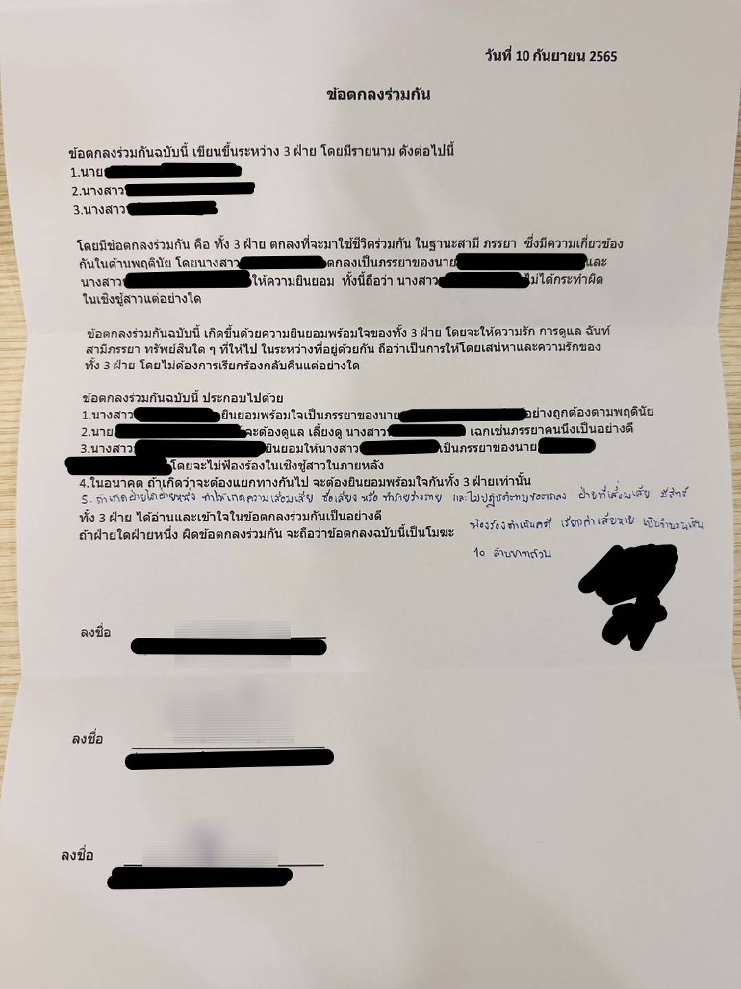 นายเอกสิทธิ์กล่าวว่า ต่อมาฝ่ายทอมได้มีการร้องขอการไปอยู่ในลักษณะชาย 1 หญิง 2 หากไม่มีการพอใจกันขึ้นมาอาจจะมีการฟ้องร้องในเรื่องของการเป็นชู้ เพราะผู้ถูกกล่าวหามีทะเบียนสมรสกันอยู่ จึงทำข้อตกลงเพื่อป้องกันตัวเอง โดยมีข้อห้ามในเรื่องการทำร้าย ทำให้เสียชื่อเสียง แต่ข่าวที่ออกไปกลายเป็นสัญญาทาส จากการตรวจสอบหลักฐานแล้ว ไม่ใช่เป็นเรื่องของสัญญาทาสแต่อย่างใด แต่เป็นการทำสัญญาที่มีข้อตกลงกันเอง โดยไม่การบังคับหรือขู่เข็ญแต่อย่างใด