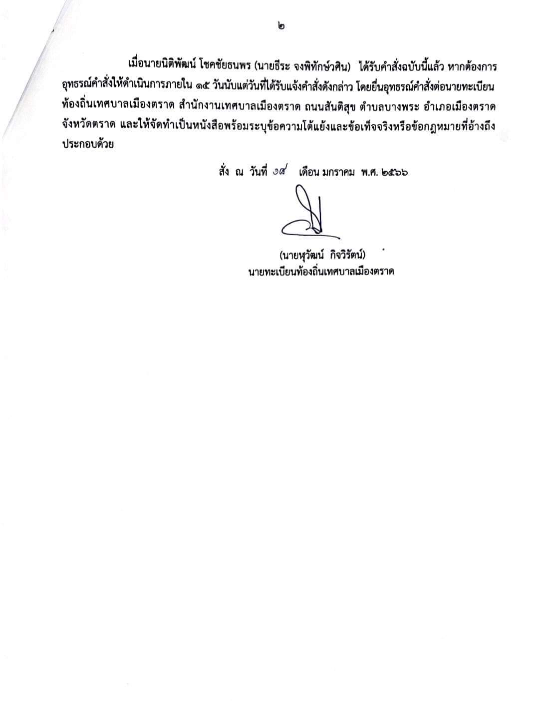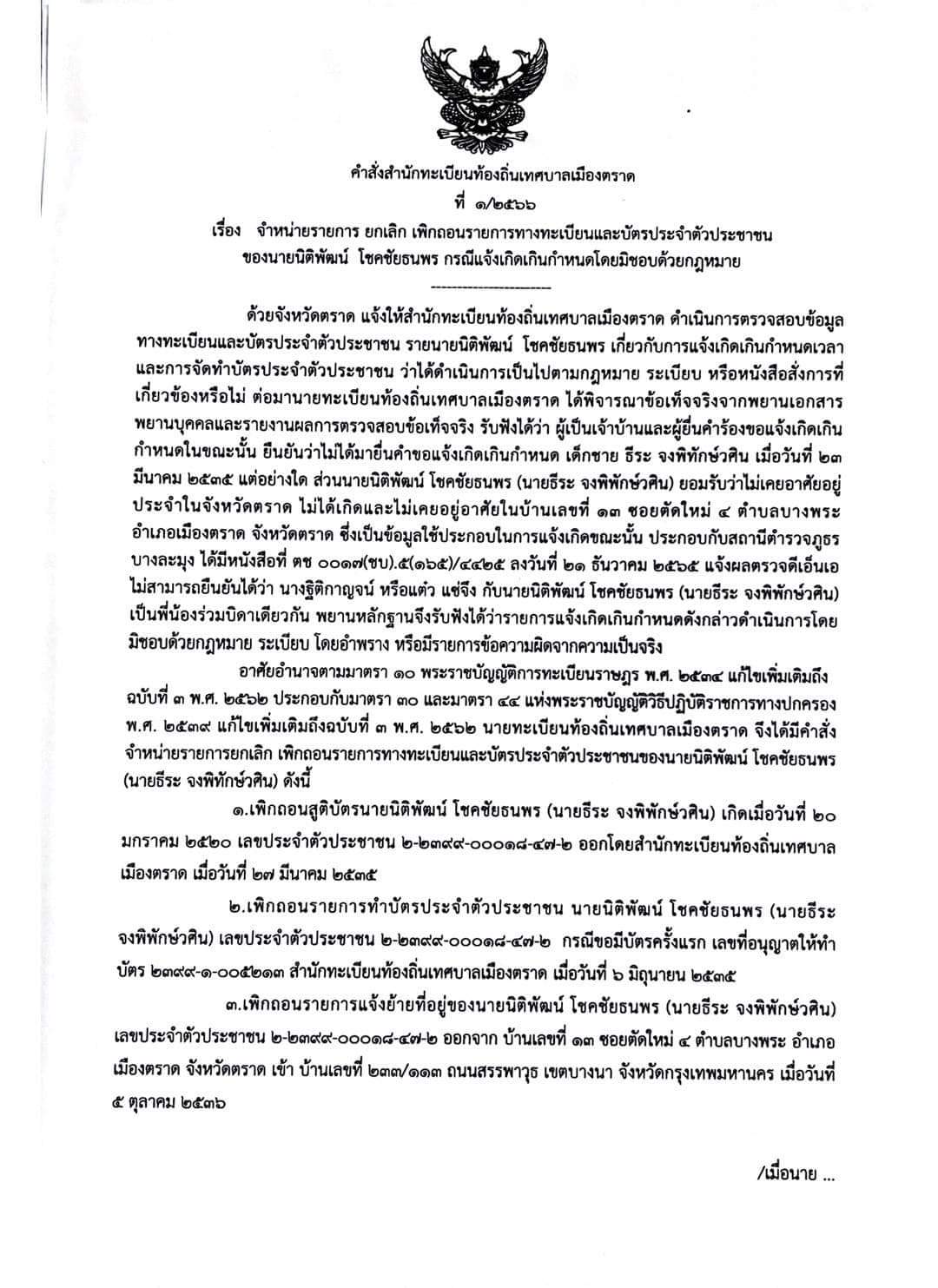 “ล่าสุด ตนได้รับรายงานจากอธิบดีกรมการปกครองถึงการดำเนินการในกรณีดังกล่าว ซึ่งจากการสืบสวนของสำนักทะเบียนท้องถิ่นเทศบาลเมืองตราด พบว่า นายนิติพัฒน์ โชคชัยธนพร ไม่ใช่คนไทย จึงได้มีคำสั่งจำหน่ายรายการ ยกเลิก เพิกถอนรายการทางทะเบียนและบัตรประจำตัวประชาชนของนายนิติพัฒน์ โชคชัยธนพร กรณีแจ้งเกิดเกินกำหนดโดยมิชอบด้วยกฎหมาย ทั้งเพิกถอนสูติบัตร เพิกถอนรายการทำบัตรประจำตัวประชาชน และเพิกถอนรายการแจ้งย้ายที่อยู่ของนายนิติพัฒน์ โชคชัยธนพร ตามคำสั่งสำนักทะเบียนท้องถิ่นเทศบาลเมืองตราด ที่ 1/2566 ลงวันที่ 18 มกราคม 2566 ลงนามโดย นายฬุวัฒน์ กิจวิรัตน์ นายทะเบียนท้องถิ่นเทศบาลเมืองตราด” นายสุทธิพงษ์ฯ กล่าวเน้นย้ำ