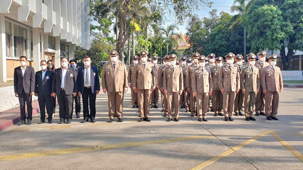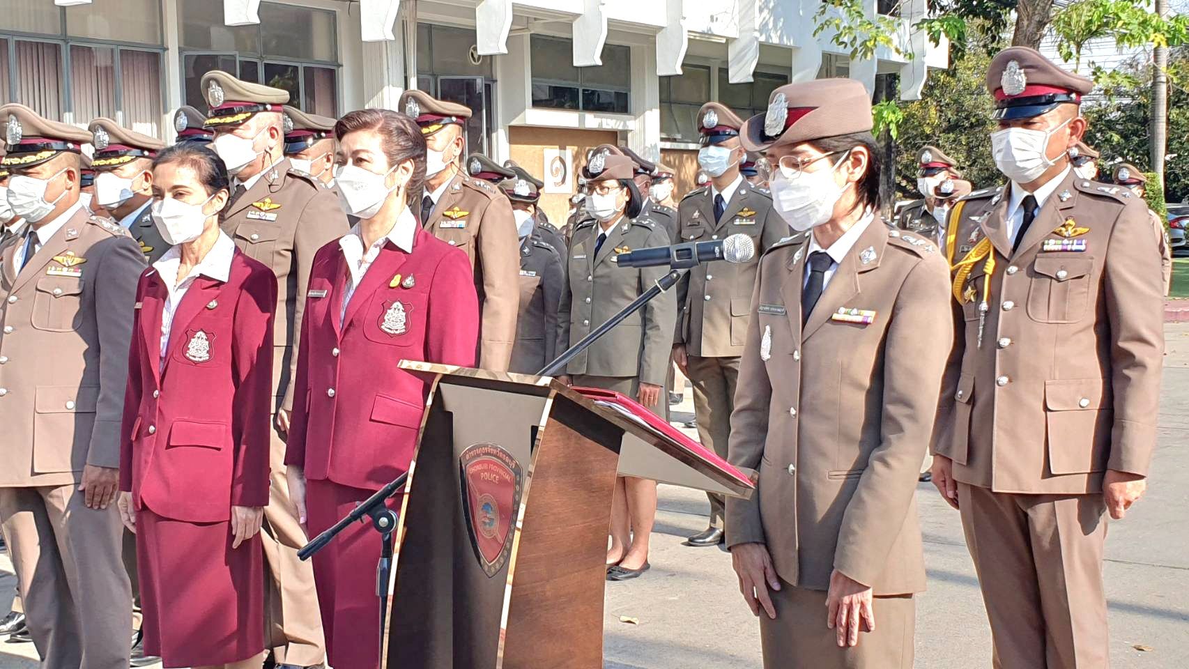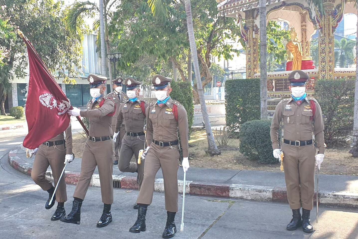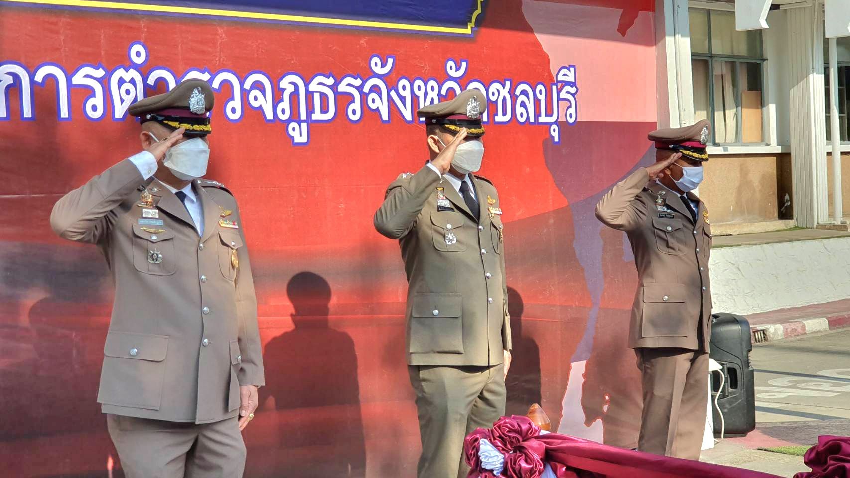 จากนั้น พล.ต.ต.กัมพล ลีลาประภาภรณ์ ผู้บังคับการตำรวจภูธรจังหวัดชลบุรี พร้อม รองผู้บังคับการตำรวจภูธรจังหวัดชลบุรี เดินตรวจแถวกองเกียรติยศและรับมอบหน้าที่ในการปฏิบัติหน้าที่