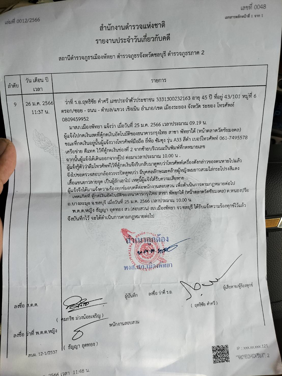 เมื่อเวลาประมาณ 11.00 น วันที่ 30 มกราคม 2566 ว่าที่ ร.อ.ฤทธิชัย คำศรี หัวหน้าฝ่ายนโยบายและแผนงานเทศกิจ เมืองพัทยา อ.บางละมุง จ.ชลบุรี ได้เข้าแจ้งความ ต่อ พ.ต.ต.หญิง ธัญญา อุดทอง พนักงานสอบสวน สภ.เมืองพัทยา อ.บางละมุง จ.ชลบุรี ว่าเมื่อวันที่ 26 มกราคม 2566 เวลาประมาณ 09.17 น.ได้ไปกดเงินสดที่ตู้เอทีเอ็มธนาคารกรุงไทย สาขา พัทยาใต้ (หน้าตลาดวัดชัยมงคล) และได้วางโทรศัพท์มือถือ ยี่ห้อซัมซุง รุ่น A33 สีดำ ราคาประมาณ 12,000 บาท ไว้ที่ตู้กดเงิน ช่องที่ 2 หลังจากกดเงินเสร็จ จึงได้ออกไปโดยไม่ได้หยิบโทรศัพท์มือถือไปด้วย ต่อมาเมื่อทราบว่าได้วางโทรศัพท์มือถือทิ้งไว้ จึงได้ย้อนกลับไปยังตู้กดเงินปรากฏว่าโทรศัพท์มือถือดังกล่าวได้หายไป
