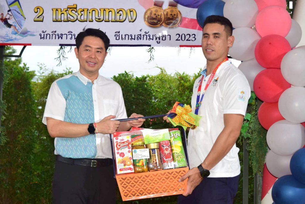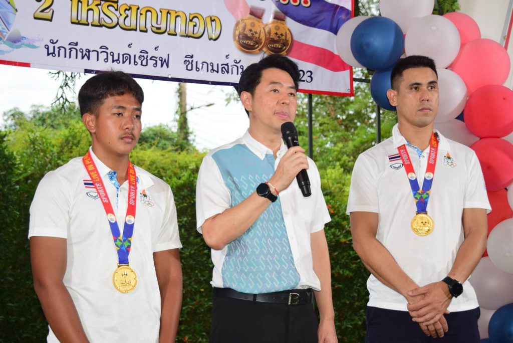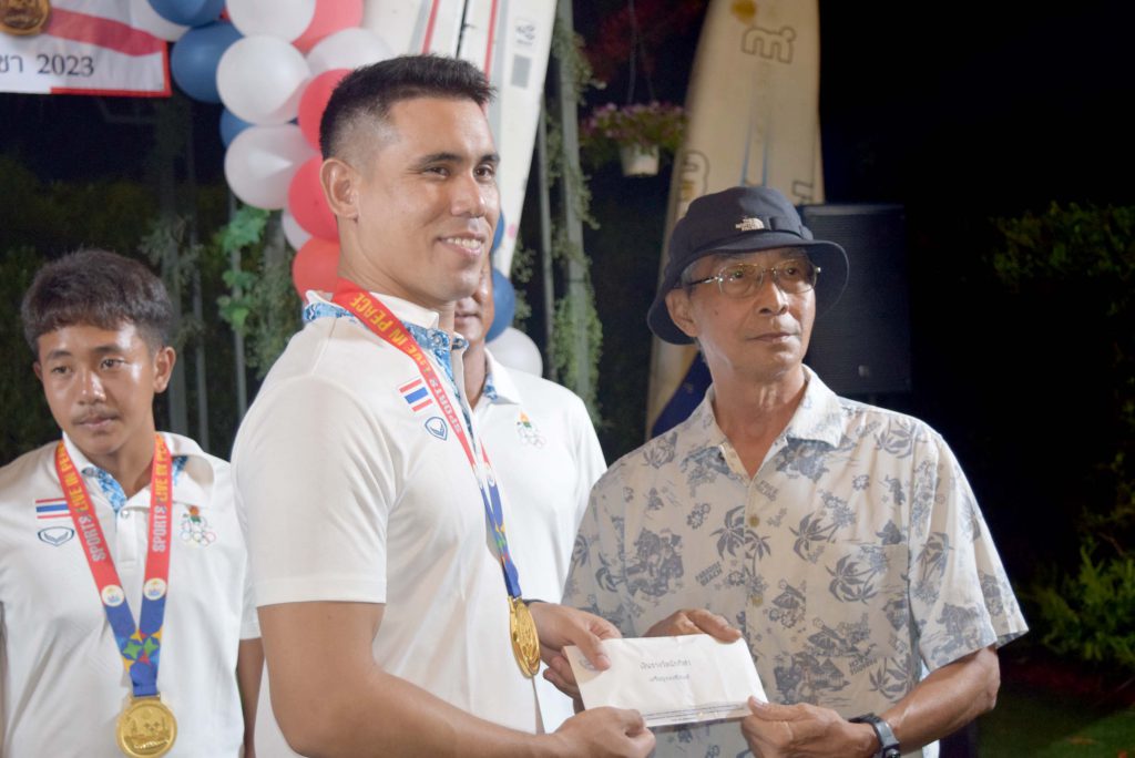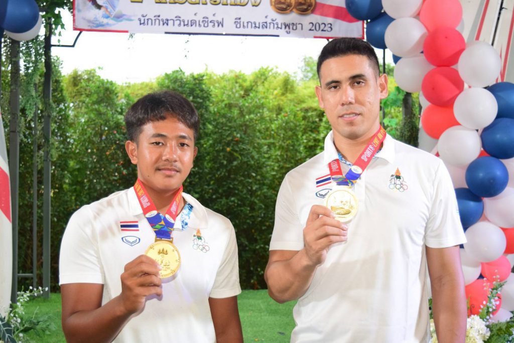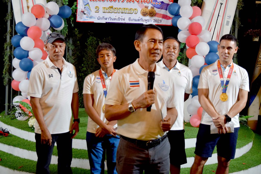 สำหรับนักกีฬาวินด์เซิร์ฟที่คว้า 2 เหรียญทอง ในการแข่งขันกีฬาซีเกมส์ 2023 ประกอบด้วย 1. นายภาสพงษ์ เลี้ยงหล่ำ รุ่นไอคิวฟอยด์ เยาวชน อายุไม่เกิน 19 ปี และ 2.นายเอก บุญสวัสดิ์ รุ่นไอคิวฟอยด์ ชาย ที่สามารถฝ่าด่านกฎกติกาของเจ้าภาพจัดการแข่งขันมาให้ชาวไทยทุกคนได้ภาคภูมิใจในครั้งนี้ หลังเสร็จสินพิธีการทางสมาคมวินด์เซิร์ฟแห่งประเทศไทย ได้มอบเงินเพื่อเป็นขวัญกำลังใจให้กับ 2 นักกีฬา จำนวน 100,000 บาท ทั้งนี้ในงานได้จัดเลี้ยงอาหารให้แก่ผู้เข้าร่วมงาน พร้อมการแสดงดนตรีสร้างสีสัน ท่ามกลางบรรยากาศเป็นไปด้วยความอบอุ่น และเป็นกันเอง……