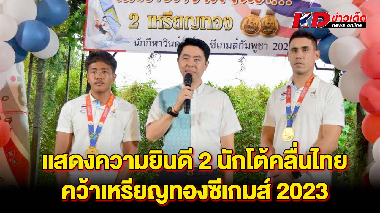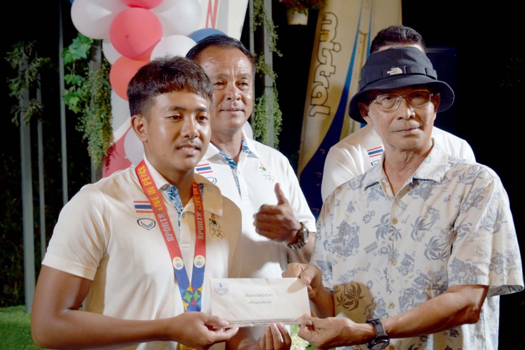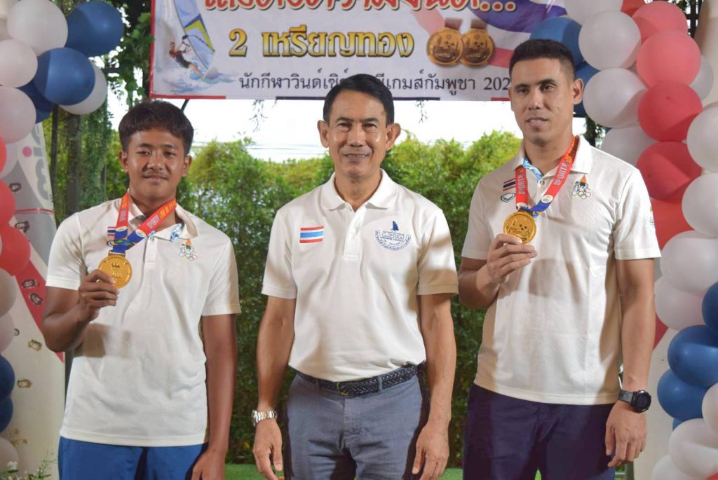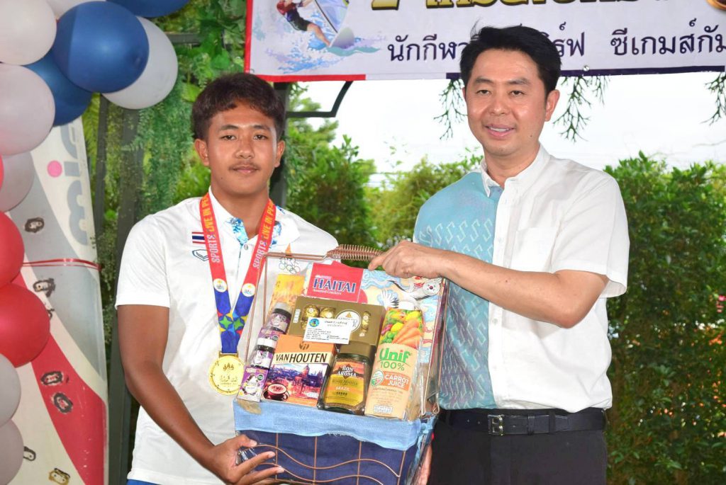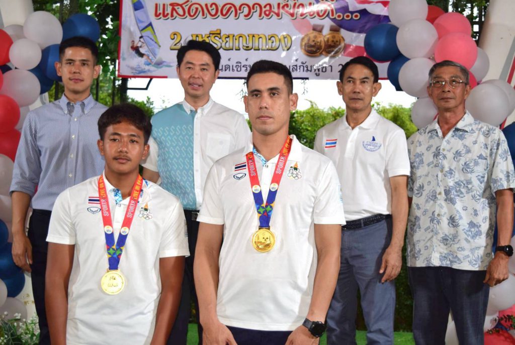 สำหรับนักกีฬาวินด์เซิร์ฟที่คว้า 2 เหรียญทอง ในการแข่งขันกีฬาซีเกมส์ 2023 ประกอบด้วย 1. นายภาสพงษ์ เลี้ยงหล่ำ รุ่นไอคิวฟอยด์ เยาวชน อายุไม่เกิน 19 ปี และ 2.นายเอก บุญสวัสดิ์ รุ่นไอคิวฟอยด์ ชาย ที่สามารถฝ่าด่านกฎกติกาของเจ้าภาพจัดการแข่งขันมาให้ชาวไทยทุกคนได้ภาคภูมิใจในครั้งนี้ หลังเสร็จสินพิธีการทางสมาคมวินด์เซิร์ฟแห่งประเทศไทย ได้มอบเงินเพื่อเป็นขวัญกำลังใจให้กับ 2 นักกีฬา จำนวน 100,000 บาท ทั้งนี้ในงานได้จัดเลี้ยงอาหารให้แก่ผู้เข้าร่วมงาน พร้อมการแสดงดนตรีสร้างสีสัน ท่ามกลางบรรยากาศเป็นไปด้วยความอบอุ่น และเป็นกันเอง……