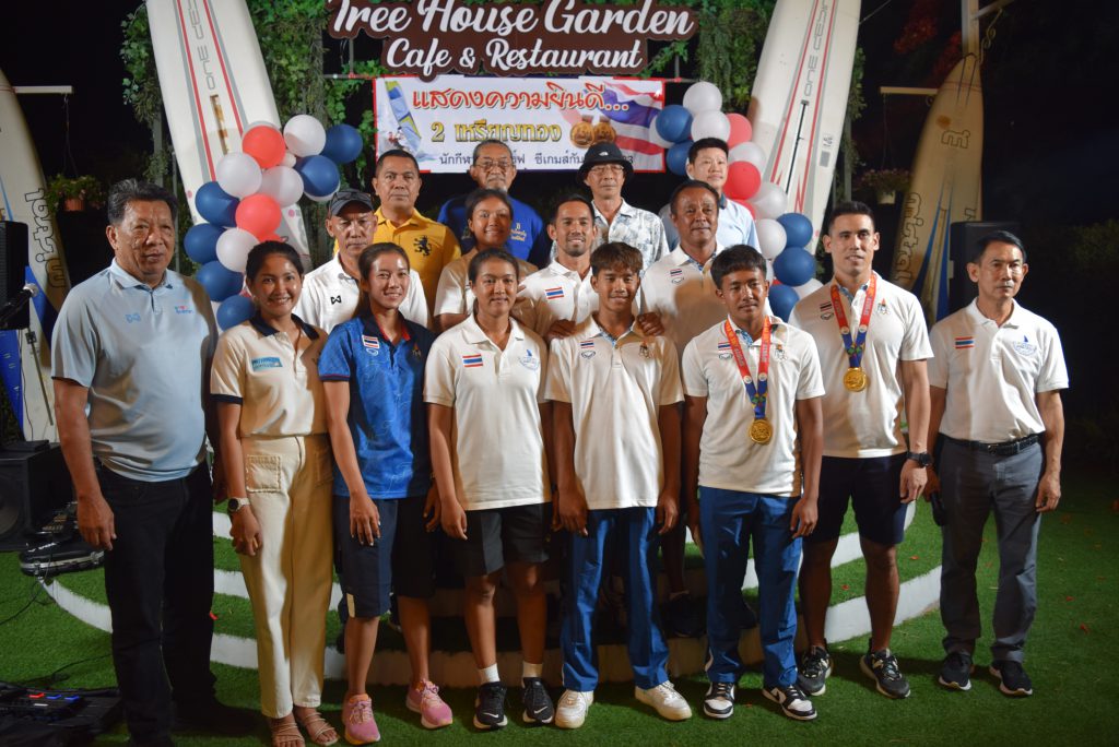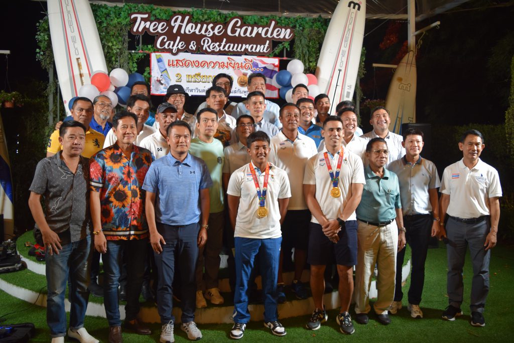 เย็นวันที่ 8 มิ.ย. 66 ที่ ร้านทรีเฮ้าส์ การ์เด้น คาเฟ่ ภายในซอยเขามะกอก 9 ต.ห้วยใหญ่ สมาคมสมาคมวินด์เซิร์ฟแห่งประเทศไทย ได้จัดงานเลี้ยงแสดงความยินดี นักกีฬาวินด์เซิร์ฟทีมชาติไทย ที่ คว้า 2 เหรียญทอง ในการแข่งขันกีฬาซีเกมส์ 2023 ณ ประเทศกัมพูชา ระหว่างวันที่ 5-17 พฤษภาคมที่ผ่านมา โดยมี นายปรเมศวร์ งามพิเชษฐ์ นายกเมืองพัทยา เป็นประธานแสดงความยินดีกับ 2 นักกีฬาวินด์เซิร์ฟ พร้อมด้วย พล.ร.ท.ศรายุทธ แดงเทศ อุปนายกสมาคมวินด์เซิร์ฟแห่งประเทศไทย นายพัฒนา บุญสวัสดิ์ เลขานุการสมาคมฯ นายกฤษณะ บุญสวัสดิ์ รองนายกเมืองพัทยา สมาชิกสภาเมืองพัทยา คณะกรรมการสมาคมฯ นักกีฬาวินด์เซิร์ฟ และสื่อมวลชน เข้าร่วมแสดงความยิน
