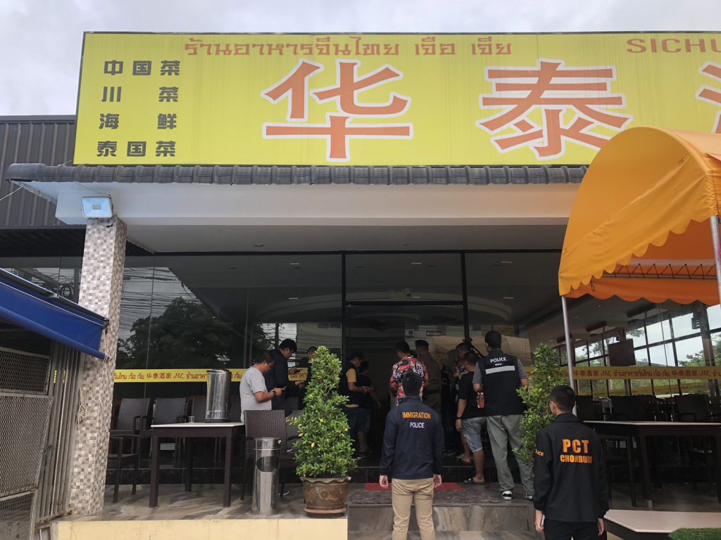 จากการตรวจค้น พบว่าเป็นร้านอาหารไทย-จีน ส่วนใหญ่เปิดร้านรับลูกค้ากรุ๊ปทัวร์คนจีน และบริเวณห้องครัวพบ น.ส.ยา ซอร์ อายุ 19 ปี และน.ส.นาง เปบิ อายุ 19 ปี สองผู้ช่วยกุ๊ก ชาวเมียนมาร์ (พม่า) กำลังจัดเตรียมวัตุดิบในการทำอาหาร ตำรวจจึงได้ทำการขอตรวจสอบเอกสารการทำงานของบุคคลต่างด้าวทั้งสอง แต่ไม่สามารถนำเอกสารมาแสดงได้ในทันที จึงควบคุมตัวพนักงานสาวชาวเมียนมาร์ พร้อมทั้ง นายประเทือง ยานะ อายุ 43 ปี ผู้จัดการร้าน ไปสอบสวนที่สำนักงานตรวจคนเข้าเมืองจังหวัดชลบุรี