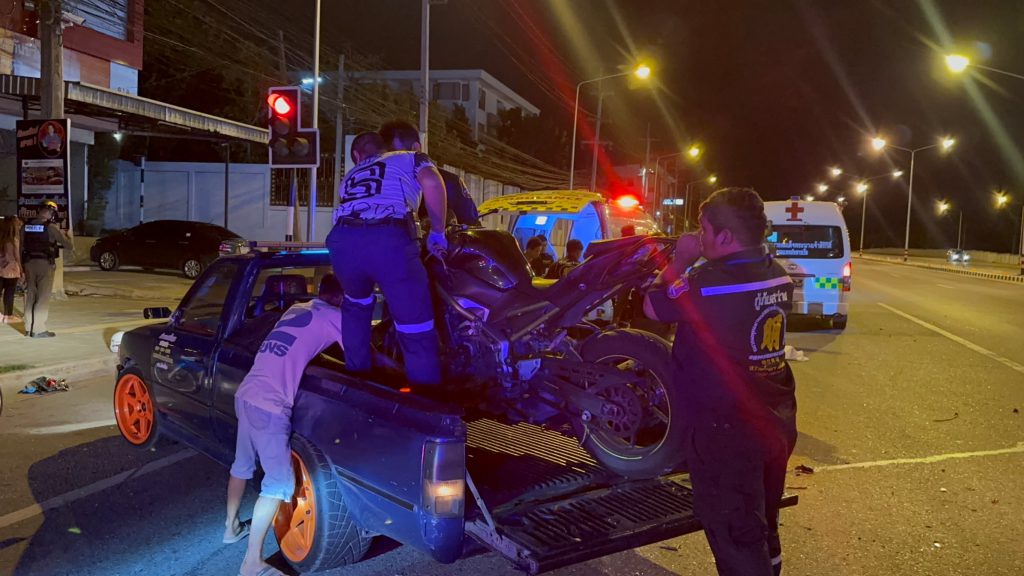 เมื่อเวลา 01.00 น. ของวันที่ 2 ก.ค.66 พ.ต.ท.สินสมุทร์ บุญทัศนา สารวัตร (สอบสวน) สภ.สัตหีบ อ.สัตหีบ จ.ชลบุรี ได้รับแจ้งมี จยย.บิ๊กไบค์ พุ่งชนท้าย รถเก๋งมีผู้ได้รับบาดเจ็บอาการสาหัส บริเวณแยกไฟแดง กองเรือยุทธการ ถนนสุขุมวิท ขาเข้าระยอง อ.สัตหีบ จ.ชลบุรี  จึงรุดไปตรวจสอบพร้อมหน่วยกู้ชีพโรงพยาบาลสมเด็จพระนางเจ้าสิริกิติ์ กรมแพทย์ทหารเรือ หน่วยกู้ภัยมูลนิธิสว่างโรจนธรรมสถานสัตหีบ