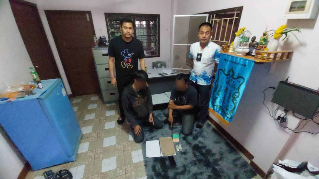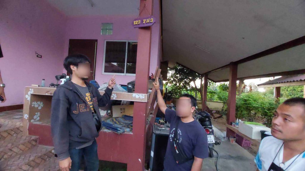 ในเวลาต่อมา พบชายไทยจำนวน 2 คน ยืนอยู่บริเวณหน้าบ้านหลังดังกล่าว แสดงท่าทางมีพิรุธ ตำรวจจึงแสดงตัวเข้าตรวจสอบ ทราบชื่อคือ นายพรเทพ หรือดาม ไพรชัฎ อายุ 27 ปี และ นายตะวัน หรือเอ็ม แป้นห้วย อายุ 27 ปี สองชาวจังหวัดอุทัยธานี ตรวจค้นเจอโทรศัพท์มือถือที่ใช้ในการติดต่อทวงเงินกู้นอกระบบ ก่อนขยายผลตรวจค้นบ้านพักเป้าหมายหลังดังกล่าว ยังพบนามบัตรชักชวนเงินกู้นับพันใบ ระบุชื่อ ”ทรัพย์สมบูรณ์“ พร้อมข้อความ เงินทุน-เงินด่วน สำหรับท่านที่มีอาชีพค้าขาย ธุรกิจต่างๆ มีรายได้ทุกวันแต่ขาดเงินลงทุน เพียงติดต่อเรา ปัญหาของท่านจะหมดไป ลงเงิน 2,000 – 200,000 บาท อนุมัติง่ายให้วงเงินสูง