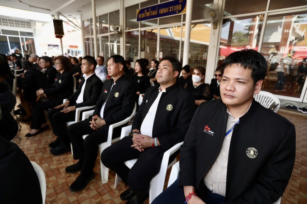 นายชัยรัตน์ รักทอง ประธานคณะกรรมการตรวจสอบและติดตามการบริหารงานตำรวจ (กต.ตร.) สภ.เมืองพัทยา พร้อมคณะ กต.ตร.ฯ, ว่าที่ร้อยตรีชาญยุทธ ยังปรีดา คณะทำงานนายกเมืองพัทยา (ด้านการปกครองและรักษาความสงบเรียบร้อย), นางอำพร แก้วแสง นายกสมาคมอุตสาหกรรมบันเทิงและการท่องเที่ยวเมืองพัทยา, นายรัฐกิจ เฮงตระกูล ที่ปรึกษารัฐมนตรีช่วยกระทรวงมหาดไทย, นางอรวรรณ สุขอนันต์วงศ์ นายกสมาคมชุมชนเมืองพัทยา พร้อมประธานชุมชนเมืองพัทยา, นางเนาวรัตน์ ค้าขาย ประธานกลุ่มพัฒนาสตรีเมืองพัทยา พร้อมกลุ่มพัฒนาสตรีอำเภอบางละมุงเมืองพัทยา,  กลุ่มสภาวัฒนธรรมเมืองพัทยา กลุ่มชมรมลูกเสือชาวบ้านอำเภอบางละมุง และญาติพี่น้องผู้วายชนม์ร่วมพิธีพร้อมเพรียง…..