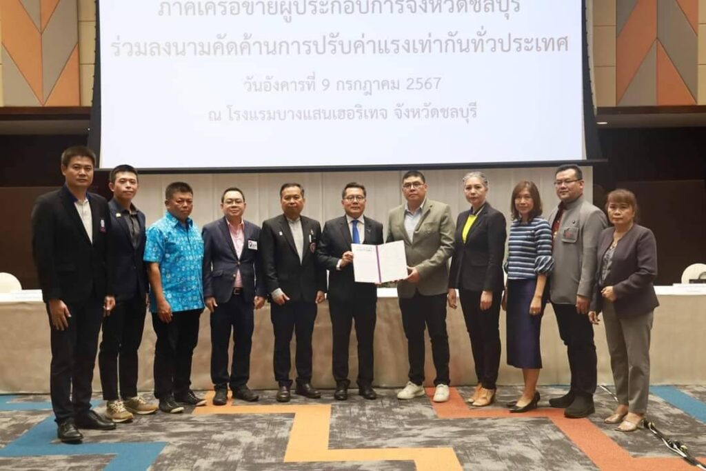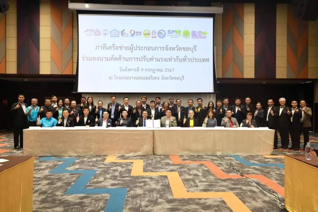 วันที่ 9 กรกฎาคม 2567 เวลา 15.30 น. นายกิตติวุฒิ ศศิวิมลพันธ์ุ ประธานสภาอุตสาหกรรมจังหวัดชลบุรี พร้อมภาคีเครือข่าย หอการค้าจังหวัดชลบุรี สมาคมอสังหาริมทรัพย์ ชลบุรีสภาอุตสาหกรรมท่องเที่ยวจังหวัดชลบุรี สมาคมสมาพันธ์ท่องเที่ยวชลบุรี สมาคมผู้ประกอบการขนส่งแหลมฉบังชลบุรี สหพันธ์สมาคมผู้ประกอบการไทย จังหวัดชลบุรี สมาคมการท่องเที่ยวและบริการศรีราชา เกาะสีชังสมาพันธ์เอสเอ็มอีไทย จังหวัดชลบุรี สภาเกษตรกรจังหวัดชลบุรี และ สภาองค์การนายจ้างแห่งประเทศไทยสำนักงานภาคตะวันออก รวม 11 หน่วยงาน ร่วมลงนามคัดค้านการปรับค่าแรงเท่ากันทั่วประเทศ ตามที่รัฐบาลได้ประกาศนโยบายการปรับอัตราค่าแรงขั้นต่ำเป็น 400 บาทพร้อมกันทั่วประเทศเพื่อเป็นของขวัญวันแรงงาน