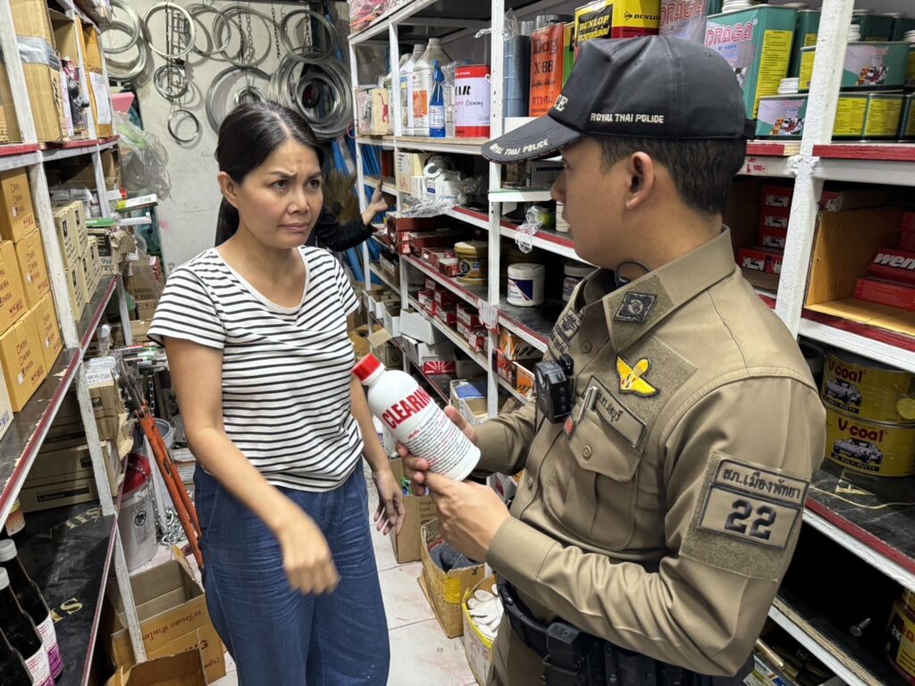 เมื่อเวลา 15.30 น. วันที่ 14 สิงหาคม 2567 พ.ต.อ.นาวิน ธีระวิทย์ ผกก.สภ.เมืองพัทยา ได้สั่งการให้ พ.ต.ต.อภินันท์ บุญยรัตน์ สวป.สภ.เมืองพัทยา ได้นำกำลังชุดปฏิบัติการพิเศษออกตรวจสอบร้านวัสดุก่อสร้าง ฮาร์ดแวร์ เคมีพันธ์ต่างๆ จำนวน 2 แห่ง หลักๆในพื้นที่เมืองพัทยา เพื่อสำรวจหาข่าวแหล่งขายเคมีอันตราย พร้อมกับประชาสัมพันธ์หลักวิธีตำเตือนและการใช้ หลังเกิดเหตุสลดเสียชีวิตยกครอบครัวทั้งหมดสามศพ ที่ จ.ชลบุรี เพราะเอาน้ำยาล้างท่อผสมโซดาไฟจนเกิดเป็นก๊าซพิษอันตราย