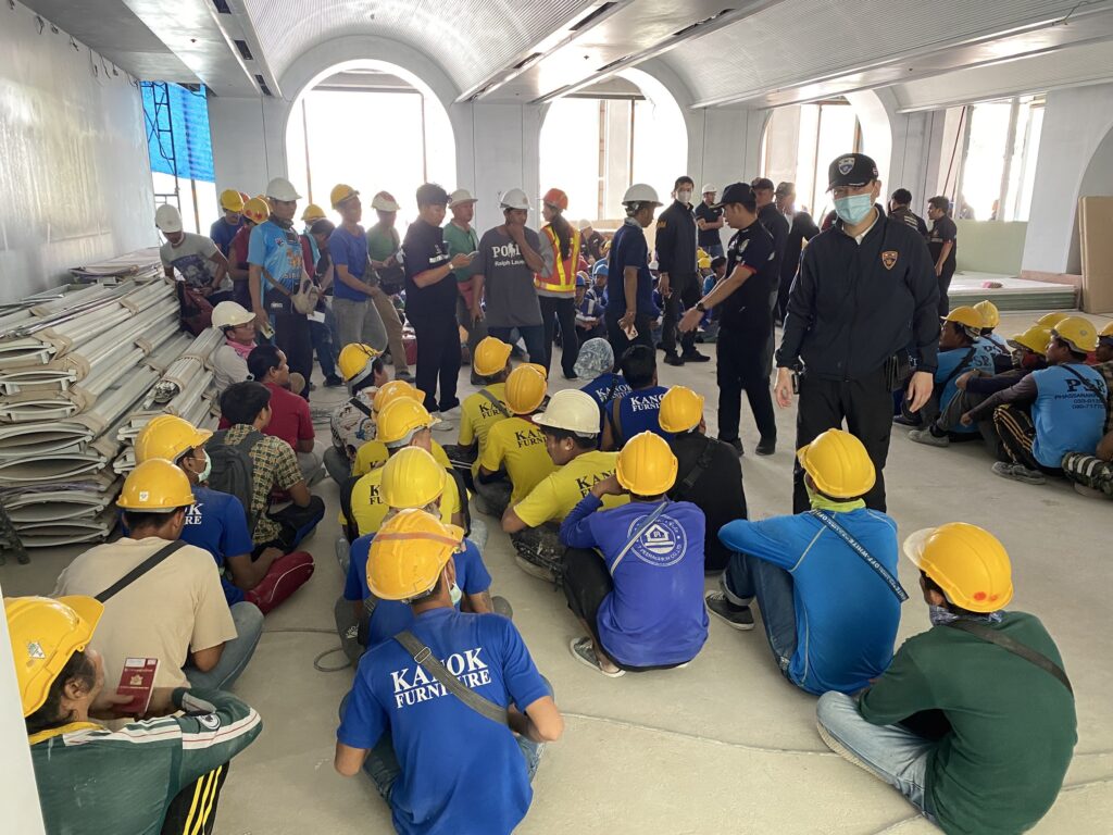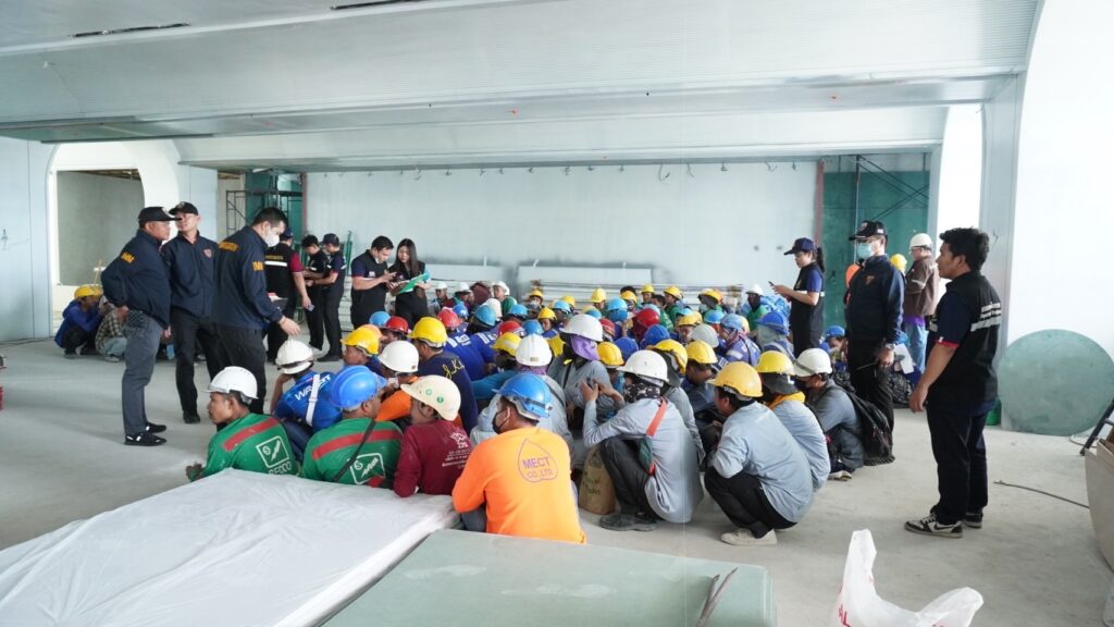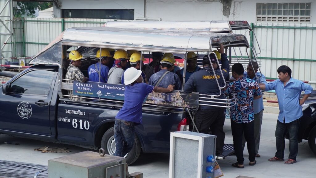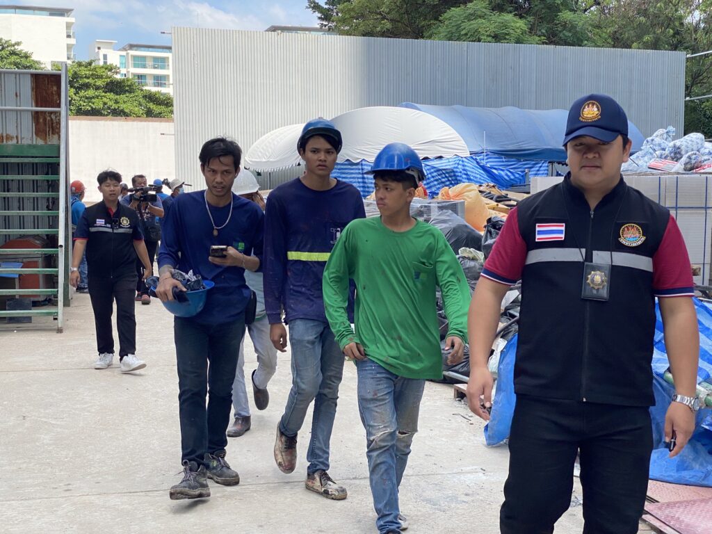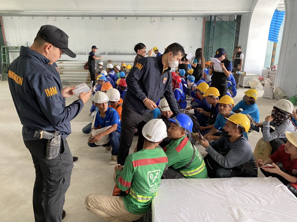7 พฤศจิกายน 2567 – เวลา 13.11 น. พ.ต.อ.นภัสพงษ์ โฆษิตสุริยมณี ผกก.ตม.จว.ชลบุรี พร้อมด้วย พ.ต.อ.จิรพงศ์ รุจิรดำรงค์ชัย ผกก.สส.บก.ตม.3 และนายวุฒิชัย รอดจร นักวิชาการแรงงานชำนาญการ สำนักงานจัดหางานจังหวัดชลบุรี สนธิกำลังกว่า 50 นาย ปิดล้อมตรวจค้นไซต์งานก่อสร้างโรงแรมหรูแห่งหนึ่ง ถนนพัทยาสายสอง จ.ชลบุรี