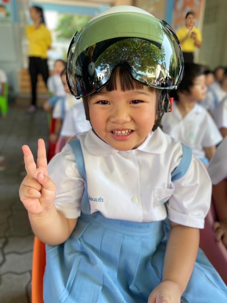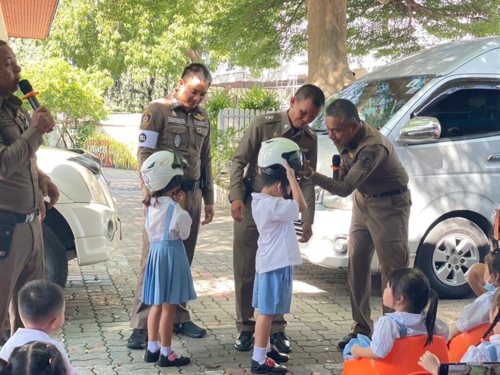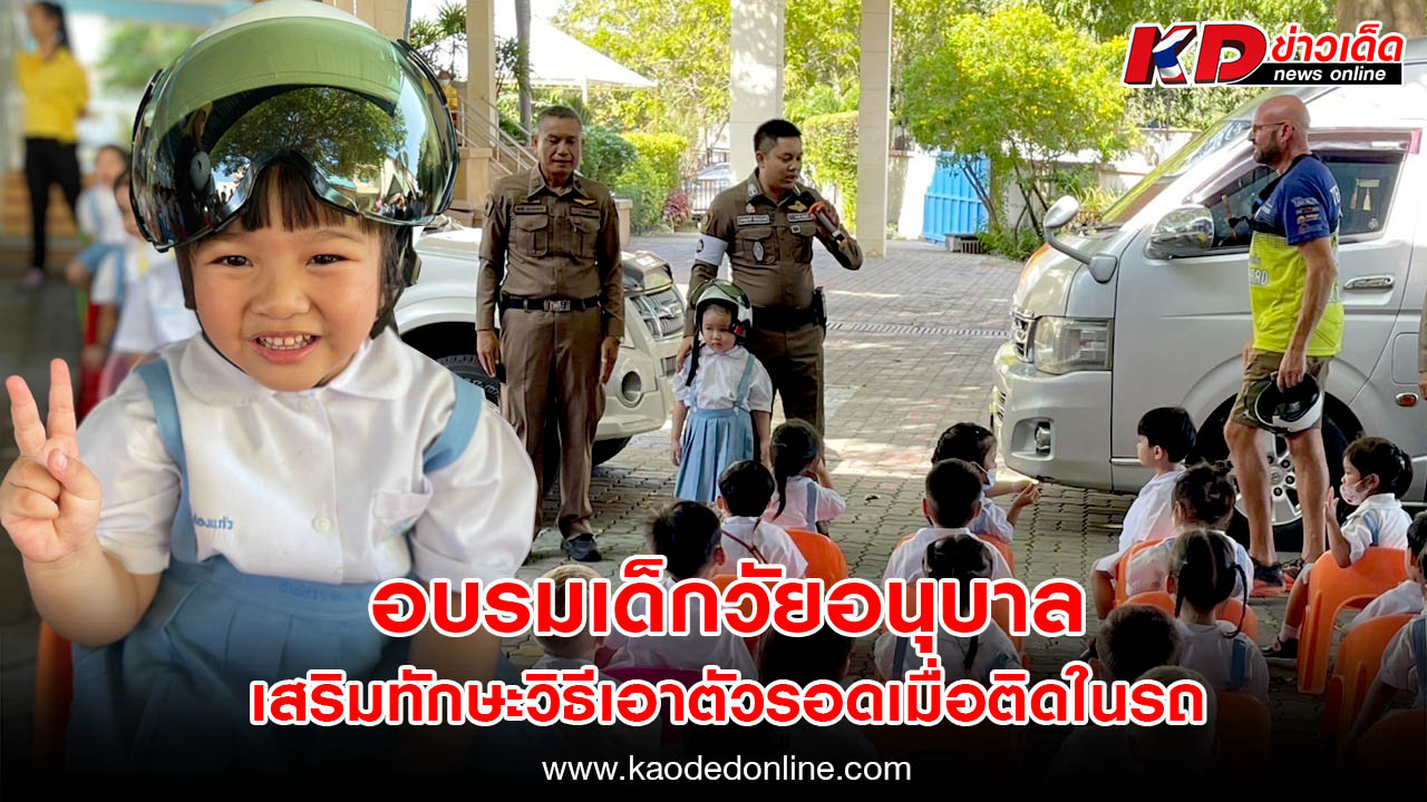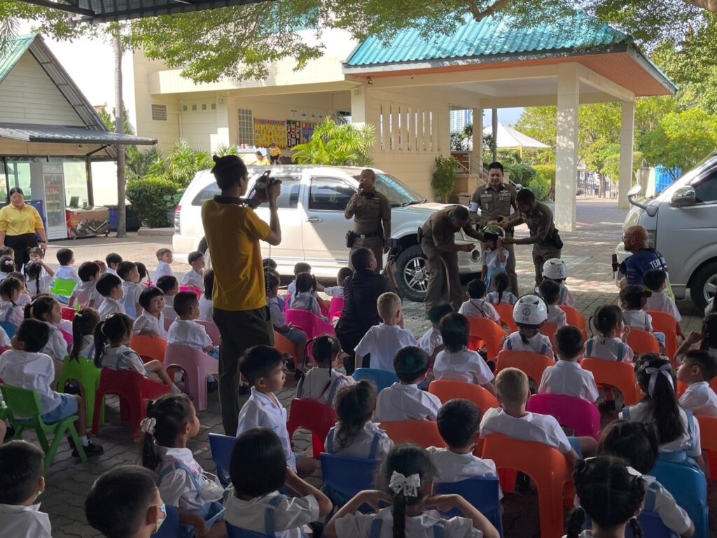 สว.จร.สภ.เมืองพัทยา นำทีมอบรมเด็กวัยอนุบาลเสริมทักษะวิธีเอาตัวรอดเมื่อติดในรถ พร้อมร่วมชาวอเมริกายูทูปเบอร์ใจบุญ แจกหมวกกันน็อก