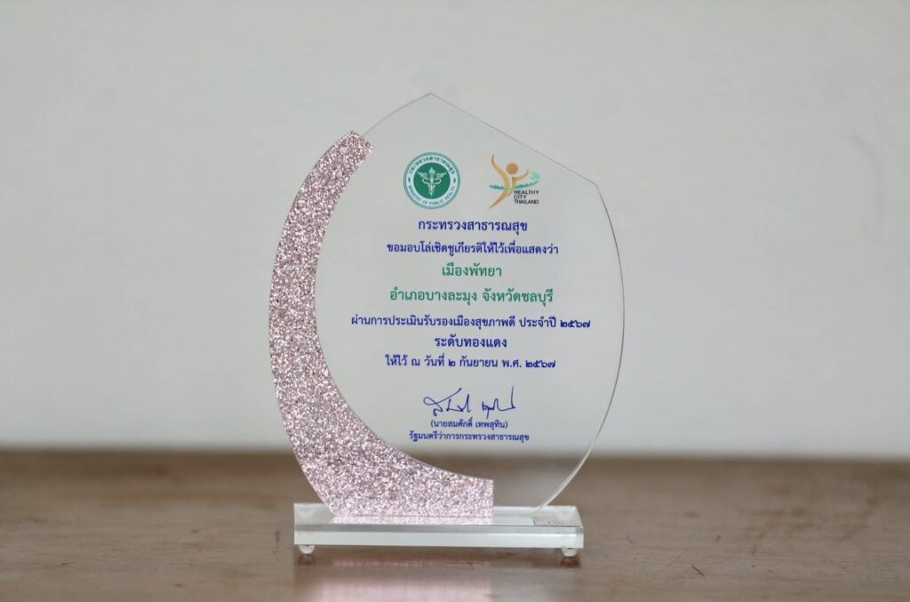 ที่ผ่านมา ดร. ศิวัช บุญเกิด รองปลัดเมืองพัทยา พร้อมด้วย ร.ต.อ.หญิง กัญรภา มุกดาสนิท ผู้อำนวยการสำนักสาธารณสุขและสิ่งแวดล้อม ร.อ.หญิง ลภัสรดา สาธาระกุล ผู้อำนวยการส่วนส่งเสริมสุขภาพ ได้รับมอบโล่เชิดชูเกียรติ “เมืองสุขภาพดี การส่งเสริมสุขภาพในชุมชนอย่างมีส่วนร่วม เพื่อสุขภาวะที่ดี”