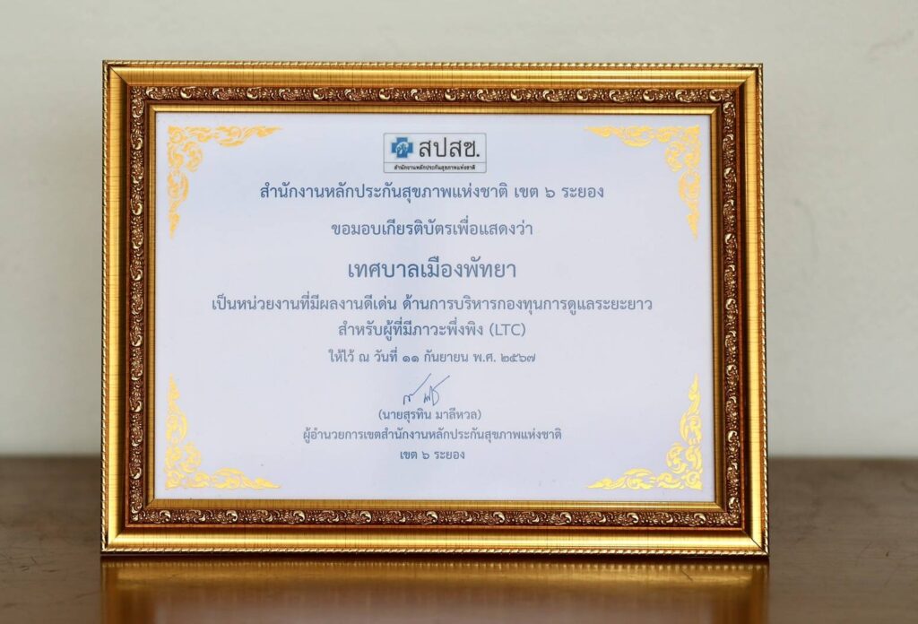 ซึ่งถือว่าเป็นรางวัลความภาคภูมิใจของเมืองพัทยา ที่ได้รับโล่เชิดชูเกียรติ “เมืองสุขภาพดี การส่งเสริมสุขภาพในชุมชนอย่างมีส่วนร่วม เพื่อสุขภาวะที่ดี” จากกระทรวงสาธารณสุข สำนักงานหลักประกันสุขภาพแห่งชาติ และองค์กรปกครองส่วนท้องถิ่น ประกอบด้วย โล่ประกาศเกียรติคุณ ซึ่งเมืองพัทยาได้มีการบูรณาการความร่วมมือเครือข่าย ภายใต้โครงการบูรณาการการพัฒนาการจัดบริการผู้สูงอายุในชุมชน ผ่านการสร้างเครือข่ายองค์กรปกครองส่วนท้องถิ่น ระยะเวลา 3 ปี (พ.ศ. 2565 – 2568) คือ “ด้านการจัดบริการโรงเรียนผู้สูงอายุในชุมชน (Elderly School in the Community) ซึ่งเป็นการดำเนินงานตามนโยบาย Better Pattaya ด้านการพัฒนาคุณภาพชีวิตผู้สูงวัยเป็น Smart Senior ในการประชุมและสัมมนาวิชาการระดับนานาชาติ เครือข่ายนักบริหารจัดการสังคมสูงวัยขององค์กรปกครองส่วนท้องถิ่น และอีก 1 ประกาศเกียรติคุณ ที่เมืองพัทยาเป็นพื้นที่ต้นแบบผลงานดีเด่น “การจัดบริการสาธารณสุขสำหรับผู้ที่มีภาวะพึ่งพิง” (LTC) ในพื้นที่สำนักงานหลักประกันสุขภาพแห่งชาติ เขต 6 (สปสช.) พัฒนาและขยายความครอบคลุมบริการสาธารณสุขสำหรับผู้ที่มีภาวะพึ่งพิง” (LTC)