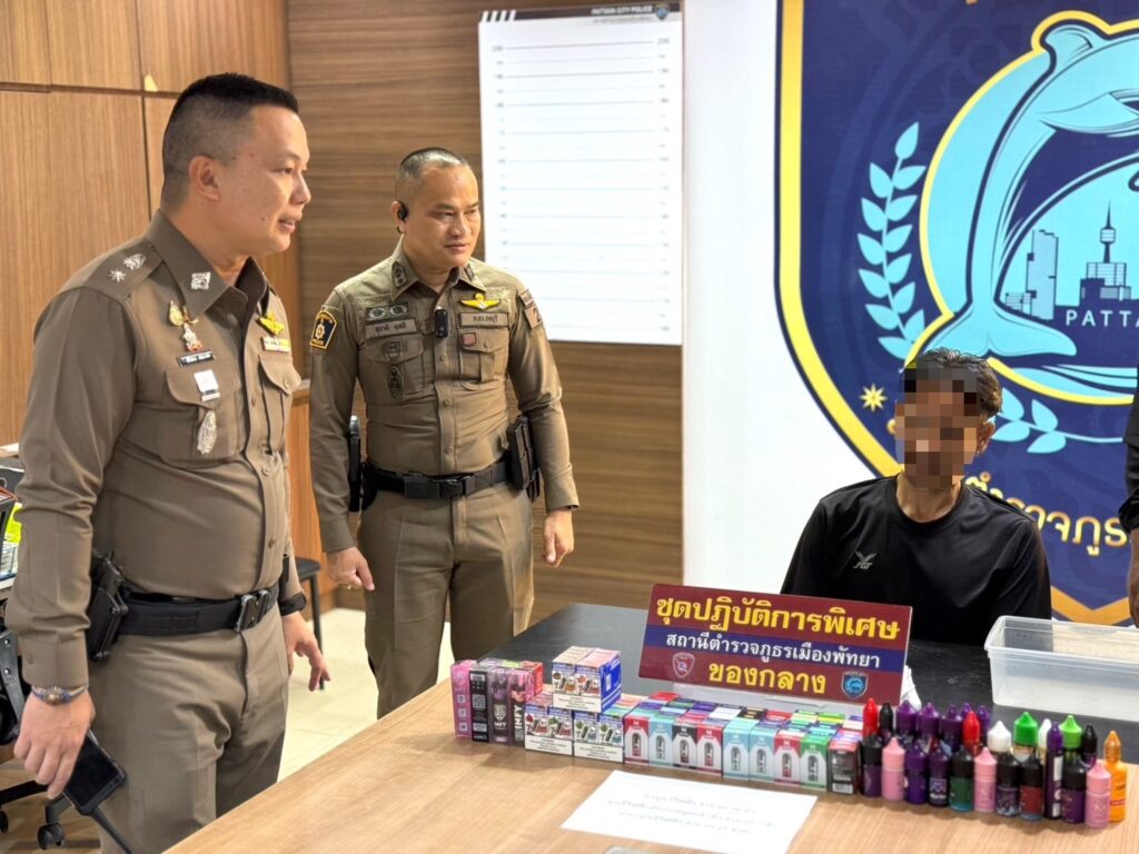 เมื่อเวลา 16.00 น. วันที่ 7 มีนาคม 2568 พ.ต.อ.เอนก สระทองอยู่ ผกก.สภ.เมืองพัทยา พ.ต.ท.สิริวัฒน์ คัชมาตย์ รอง ผกก.ป.สภ.เมืองพัทยา พ.ต.ท.สุชาติ ดุสดี สวป.สภ.เมืองพัทยา ได้สั่งการให้เจ้าพนักงานตำรวจชุดปฏิบัติการพิเศษ (ป.พิเศษ) สภ.เมืองพัทยา ร่วมกันจับกุมตัว นายกฤษณพงษ์ เกษมสิน อายุ 49 ปี พร้อมของกลางบุหรี่ไฟฟ้าชนิดพอตสูบแล้วทิ้ง น้ำยากลิ่นผลไม้ จำนวน 7 รายการ รวมทั้งสิ้น 131 ชิ้น มูลค่ากว่า 20,000 บาท โดยสามารถจับกุม ได้ที่บริเวณภายในตลาดนัดการเคหะเทพประสิทธิ์ เมืองพัทยา จ.ชลบุรี