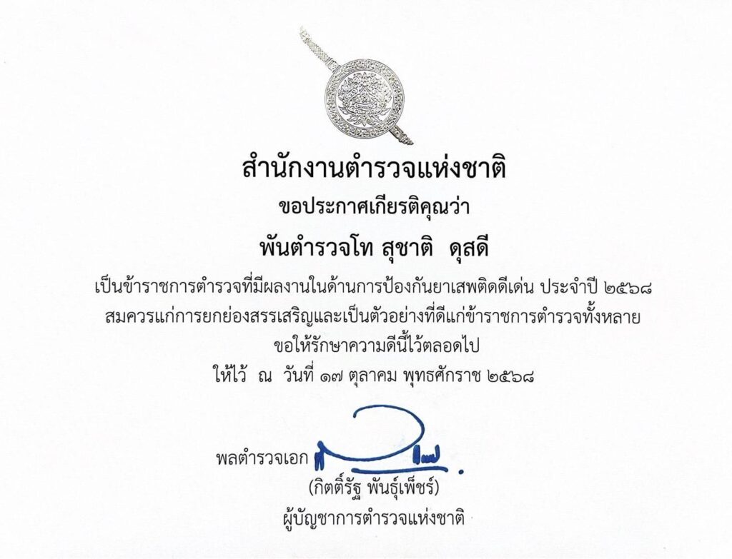 • ข้าราชการตำรวจผู้ป้องกันยาเสพติดดีเด่น 3 ปีซ้อน (พ.ศ. 2566–2568)