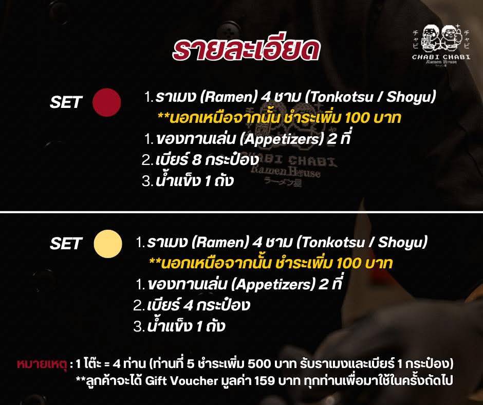 หมายเหตุ : 1 โต๊ะ = 4 ท่าน ท่านที่ 5 ชำระเพิ่ม 500 บาท (รวมราเมง + เบียร์ 1 กระป๋อง)